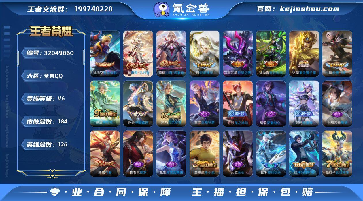 苹果Q-V6-最强王者段位-126英雄-184皮肤-1典藏皮肤-9传说-50史诗 【荣耀典藏】:孙悟空全息碎影 【传说皮肤】:澜愿照九州拓,桑启鸣野蒿,李信山海炽霜斩,赵云淬星耀世,镜炽阳神光,曜云鹰飞将,达摩黄金狮子座,孙尚香末日机甲,宫本武藏地狱之眼 【限定皮肤】:姜子牙天穹之誓,狄仁杰阴阳师,赵云皇家上将,嬴政优雅恋人,扁鹊奇幻香踪,元歌无心,狄仁杰魔术师,狄仁杰万华元夜,项羽海滩派对,程咬金演武夺筹,韩信飞衡,李元芳云中旅人,杨戬潮玩骑兵,鬼谷子原初探秘者,鬼谷子五谷丰年,沈梦溪大漠名商,裴擒虎李小龙,裴擒虎擒涛扼浪,云中君纤云弄巧,李信山海炽霜斩,猪八戒西部大镖客,上官婉儿梁祝,鲁班大师探海日志,桑启海盐诗旅,阿古朵江河有灵,张良古海寻踪,高渐离燃音魔法,妲己灵卜魔法,鬼谷子天穹祈灯,伽罗琥珀纪元,沈梦溪龙舞盛年,刘邦剑破天穹,程咬金群星魔术团 【年限皮肤】:韩信飞衡,李信山海炽霜斩,澜愿照九州拓 【赛季限定】:鬼谷子原初探秘者,狄仁杰万华元夜,程咬金演武夺筹,沈梦溪大漠名商,李元芳云中旅人,桑启海盐诗旅,裴擒虎擒涛扼浪,鲁班大师探海日志,张良古海寻踪,鬼谷子天穹祈灯,刘邦剑破天穹,姜子牙天穹之誓,东皇太一噬灭天穹,太乙真人谧流熔炉,钟馗虚灵犬护,甄姬逆浪荇歌 【战令限定】:猪八戒西部大镖客,扁鹊奇幻香踪,杨戬潮玩骑兵,高渐离燃音魔法,妲己灵卜魔法 【史诗皮肤】:女娲万灵启世,黄忠百相守梦,扁鹊灵蛊蚀心,狂铁龙之律动,阿轲化蝶舞,弈星万物之道,黄忠怒海争锋,伽罗琥珀纪元,高渐离燃音魔法,妲己灵卜魔法,阿古朵江河有灵,刘禅电玩爆裂旋风,扁鹊奇幻香踪,元歌无心,鬼谷子五谷丰年,云中君纤云弄巧,裴擒虎李小龙,橘右京修罗,不知火舞魅语,韩信飞衡,上官婉儿梁祝,公孙离无限星赏官,狄仁杰鹰眼统帅,阿轲节...
