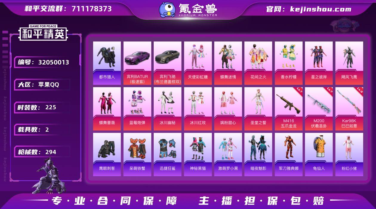 苹果 手Q-12粉装-3特效枪-2载具-2粉色飞行器-94411热力值-16王牌印记-225套装-294枪皮 【热门品类】:套装-都市猎人,角色-军刀雅典娜,旭日初心兜帽大衣,套装-龟仙人,套装-粉红小猪 【粉色载具】:宾利BATUR(极速紫),宾利飞驰(布罗德盖棕双色) 【粉色套装】:粉装-天使彩虹糖,粉装-蝶舞迷情,粉装-花间之火,粉装-香水柠檬,粉装-星之彼岸,粉装-飓风飞鹰,粉装-蝶舞蔷薇,粉装-蓝莓炮弹,粉装-冰川幽秘,粉装-冰川红玫,粉装-飒粉甜心,角色-圣堂之誓 【粉色枪皮等级】:M416-五爪金龙(七级),Kar98K-巳巳如意(三级),M200-伏羲圣卦(七级) 【粉色枪皮】:M416-五爪金龙,Kar98K-巳巳如意,M200-伏羲圣卦 【粉色飞行器】:雪梅暗香飞行器,镜光幻境飞行翼 【粉色降落伞】:幻影战神降落伞,百万伏特降落伞,未来战士降落伞,PEL轰鸣竞梦者降落伞,锦绣火鲤降落伞,香水柠檬降落伞,暗夜玫瑰降落伞,洛神天依降落伞,蓝莓炮弹降落伞,环太平洋降落伞,垂柳戏鸭降落伞,彩虹甜喵降落伞,旋转彩虹降落伞,冰川粉黛降落伞,歌者泠鸢降落伞,暗夜鎏金降落伞,音爆索尼克降落伞,第五大道降落伞,飒粉甜心降落伞,闲梦青缨降落伞,炫光之旅降落伞,莲影清波降落伞,镜域双华降落伞,彩虹独角兽降落伞,智耀战神降落伞 【稀有套装】:套装-龟仙人,套装-燕燕于飞,套装-鱼渊荷华 【稀有枪皮】:AKM-2P战斗服款,AKM-夜灯,AKM-彩虹符号,AKM-江南烟雨,AKM-海渊国主,AKM-灼热熔岩,AKM-玉龙,AKM-生命誓言,AKM-百万伏特,AKM-破晓战魂,AKM-缤纷海域,AKM-萌趣颜团子,AKM-萝萝小趴兔,AKM-虎虎生威,AKM-霓虹街区,AKM-龙的传人,M16A4-夜灯,M16A4-幻世战舞者,M16A4-甜心亚梦,M16A4-红色方程式,SCAR-L-是爱神辣,SCAR-L-炫彩节奏,SCAR-L-玉兔迎春,SCAR-L-黄金龙骨,M416-夜灯,M416-神秘黑猫,M416-糯...