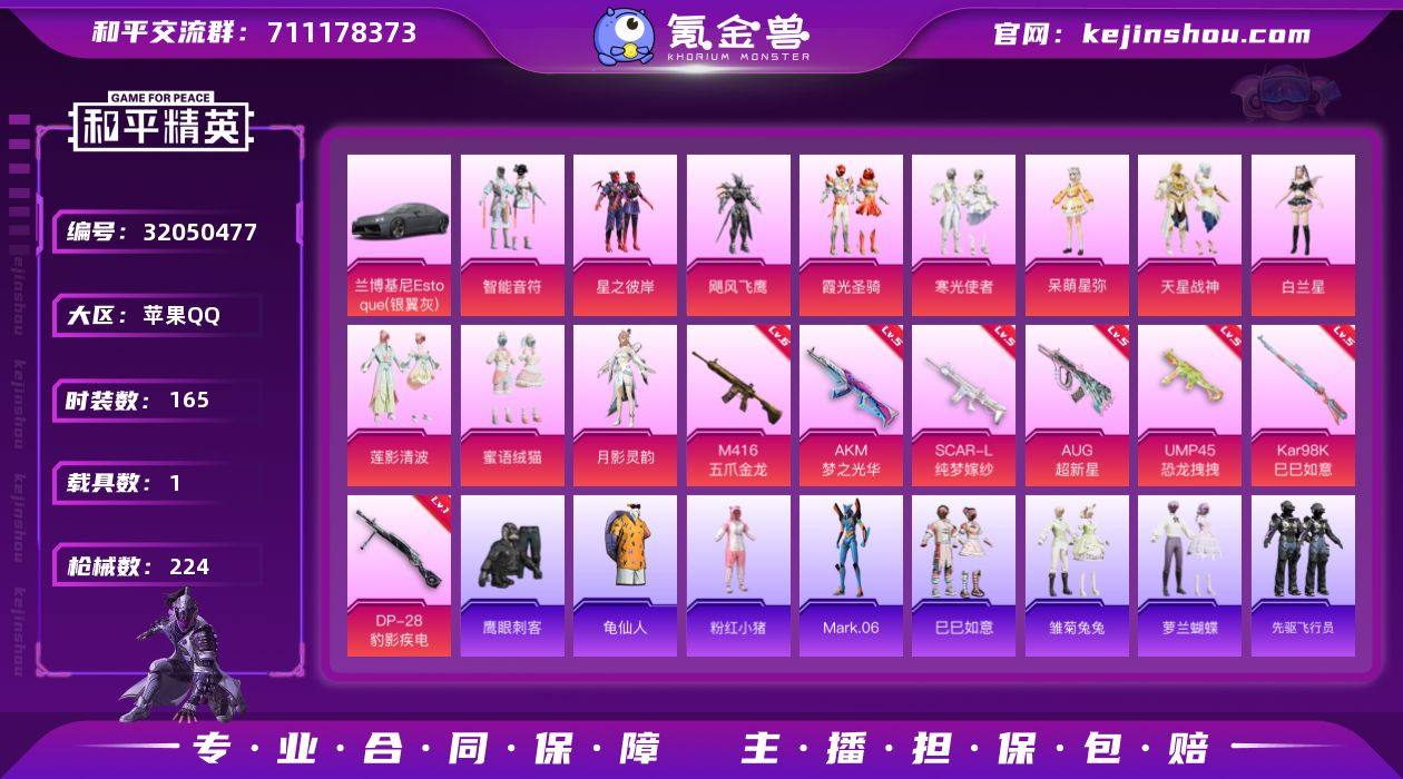 苹果 手Q-11粉装-7特效枪-1载具-4粉色飞行器-69542热力值-9王牌印记-165套装-224枪皮 【热门品类】:套装-龟仙人,套装-粉红小猪,角色-Mark.06 【粉色载具】:兰博基尼Estoque(银翼灰) 【粉色套装】:粉装-智能音符,粉装-星之彼岸,粉装-飓风飞鹰,粉装-霞光圣骑,粉装-寒光使者,角色-呆萌星弥,粉装-天星战神,角色-白兰星,粉装-莲影清波,粉装-蜜语绒猫,角色-月影灵韵 【粉色枪皮等级】:AKM-梦之光华(五级),SCAR-L-纯梦嫁纱(五级),M416-五爪金龙(六级),AUG-超新星(五级),UMP45-恐龙拽拽(五级),Kar98K-巳巳如意(五级),DP-28-豹影疾电(一级) 【粉色枪皮】:AKM-梦之光华,SCAR-L-纯梦嫁纱,M416-五爪金龙,AUG-超新星,UMP45-恐龙拽拽,Kar98K-巳巳如意,DP-28-豹影疾电 【粉色飞行器】:梦幻舞会飞行器,沙丘之主天马,花傲天飞行器,繁龙极客飞行器 【粉色降落伞】:甜心宝贝降落伞,至尊龙雀降落伞,王牌四分卫降落伞,星之彼岸降落伞,洛神天依降落伞,恐龙拽拽降落伞,圣光天使降落伞,旋转彩虹降落伞,飒粉甜心降落伞,莲影清波降落伞,沙丘之主降落伞,精灵梦叶罗丽降落伞,创世·救赎降落伞,千金淑猫降落伞,樱桃泡泡降落伞 【稀有套装】:套装-龟仙人,套装-巳巳如意,套装-雏菊兔兔,套装-萝兰蝴蝶,套装-先驱飞行员,套装-糖糖葫芦,套装-青团波波,角色-都市丽猫,套装-燕燕于飞,套装-鱼渊荷华,角色-蜜桃派对,套装-紫幽梦,套装-蓝冰羽,套装-星影赞美诗 【稀有枪皮】:AKM-2P战斗服款,AKM-星之彼岸,AKM-灼热熔岩,AKM-破晓战魂,AKM-萌趣颜团子,AKM-虎虎生威,AKM-霓虹街区,AKM-龙的传人,M16A4-凝视深渊,M16A4-夜灯,M16A4-幻世战舞者,M16A4-甜心亚梦,M16A4-红色方程式,M16A4-蓝色火焰,SCAR-L-玉兔迎春,SCAR-L-红色方程式,M416-糯团青竹,M416-红色方程式,M416-蓝色火...