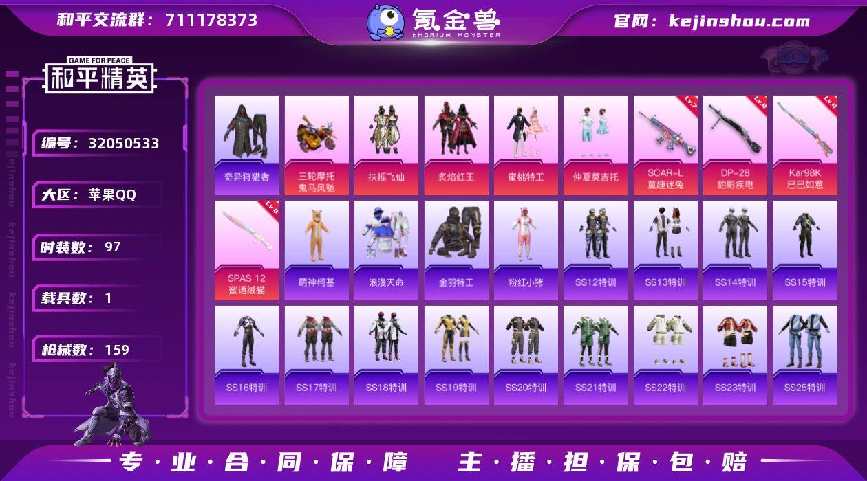 苹果 手Q-4粉装-4特效枪-1载具-0粉色飞行器-47350热力值-3王牌印记-97套装-159枪皮 【热门品类】:套装-浪漫天命,套装-奇异狩猎者,套装-金羽特工,套装-粉红小猪 【粉色载具】:鬼马风驰 【粉色套装】:粉装-扶摇飞仙,粉装-炙焰红王,粉装-蜜桃特工,粉装-仲夏莫吉托 【粉色枪皮等级】:SCAR-L-童趣迷兔(七级),Kar98K-巳巳如意(四级),SPAS-12-蜜语绒猫(四级),DP-28-豹影疾电(四级) 【粉色枪皮】:SCAR-L-童趣迷兔,Kar98K-巳巳如意,SPAS-12-蜜语绒猫,DP-28-豹影疾电 【粉色降落伞】:潮汐统领降落伞,阿狸红降落伞,海渊国主降落伞,旋转彩虹降落伞,绯穹魔姬降落伞 【稀有枪皮】:AKM-夜灯,AKM-彩虹符号,AKM-恐龙拽拽,AKM-灼热熔岩,AKM-破晓战魂,AKM-萌趣颜团子,AKM-虎虎生威,AKM-龙的传人,M16A4-幻世战舞者,M16A4-甜心亚梦,M16A4-红色方程式,M16A4-蓝色火焰,SCAR-L-炫彩节奏,SCAR-L-玉兔迎春,SCAR-L-红色方程式,SCAR-L-黄金龙骨,M416-暗星紫秘,M416-滑板小狐,M416-糯团青竹,M416-红色方程式,M416-蓝色火焰,GROZA-异彩先驱,GROZA-彩虹符号,GROZA-影袭,GROZA-紫翼圣骑,AUG-天降萌叽,AUG-耀粉歌者,QBZ-原初圣火,QBZ-彩虹符号,QBZ-飞驰魅影,M762-天降萌叽,M762-牛气冲天,M762-瑞龙福将,M762-绯红前夜,M762-镭射皇者,G36C-时空追击者,G36C-炙焰牛王,AC-VAL-天降萌叽,AC-VAL-甜心亚梦,蜜獾-天降萌叽,蜜獾-娇憨猪猪,UZI-天降萌叽,UZI-娇憨猪猪,UZI-红色方程式,UMP45-时空追击者,UMP45-生命誓言,UMP45-蓝色火焰,Vector-彩虹符号,Vector-枪炮玫瑰,Vector-百合蜜语,汤姆逊-天降萌叽,汤姆逊-异彩先驱,汤姆逊-炫彩节奏,汤姆逊-耀粉歌者,野牛-夜灯,MP5K-异彩先驱,P90-飞驰魅影,P90-巳巳如意,Kar98K-彩虹符号,Kar98K-炫彩节奏,Kar98K-王子的夏天,Kar98K...