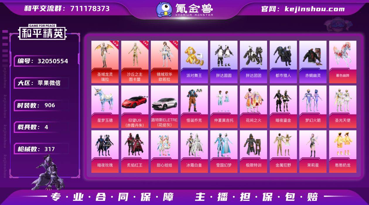 实名:可二次实名 是否支持人脸包赔:支持 粉装数量:54 特效枪数量:23 载具数:4 时装数:906 枪械数:317 赤蝎幽灵,都市猎人,胖达团团,派对舞王,胖达圆圆 三级圣域龙灵-瑞拉,一级镜域双华-欧若拉,一级沙丘之主-图卡盟 暗夜鎏金,暗夜玫瑰,暗翼战神,宝贝奶油派,冰川粉黛,冰川红玫,冰川幽秘,缤纷油彩,白兰星,冰霜白皇,白勺歌姬,彩虹甜喵,炙焰红王,电磁星,第五大道,独舞天鹅,放客神游,怪诞乔克,寒光使者,憨憨奶龙,花间之火,金属狂野,绝色倾城,极限特训,金域紫灵,狂魅哈莉,灵感创作师,洛天依,脉冲星,梦幻火箭,茉莉星,蜜桃特工,暖熊萌萌,千金淑猫,圣光天使,守护天翼,天使彩虹糖,圣堂之誓,闪耀律动,甜蜜誓约,童趣迷兔,甜心巧克力,甜心娃娃,馨动时刻,雪国幻梦,霞光圣骑,炫光之旅,绚金瑰梦,绚丽摇曳,旋转彩虹,心之回忆,樱桃泡泡,鸢尾晶梦,仲夏莫吉托 九级M416-超新星,八级UMP45-玉魂晶魄,六级P90-电糖天使,六级破片手榴弹-粉粉猫爪,五级AKM-梦之光华,五级Groza-巴啦啦小魔仙,五级M762-电糖天使,四级M249-彩虹甜喵,四级M417-第五大道,四级MG3-洛神天依,四级SCAR-L-梦幻火箭,三级AA12-G-萌骑幻想,三级AKM-暮色玫影,三级AMR-炫光之旅,三级AUG-星梦奇缘,三级DP-28-暗夜鎏金,三级M24-镜域双华,二级AWM-橘柚倾心,一级M416-墨龙九天,一级M416-心之恋语,一级P90-金丰海韵,一级P90-沙丘之主,一级UMP45-雪国精灵 暮色幽蹄,路特斯ELETRE(花绽灰),星梦玉骢,仰望U9(赤霞丹朱) 狙击之神,马上来财,极夜星羊,福马献瑞,红釉青花,SS37特训,雨过天青,玲珑侠影,缠丝流银,理性主义,霜刃之御,青翼流星,橘猫汽水,阳光菠萝,雪国风尚,超能元气,画境星梦,琴音绮想,书海巡游,SS36特训,炫彩糖果,风迹短诗,秘语星愿,SS35特训,午间小调,甜心蒙太奇,狂鲨锋刃,2B战斗服款,8号机,暗黑裁决,Alan Walker电音教主,Alan Walker,暗影哥特,暗夜傀儡,暗夜魅影,暗夜契约,冰冻风暴,缤纷果语,冰河战士,白兰地假日,贝斯之夜,白熊同盟,纯白誓言,纯白舞曲,璀璨流光,春光漫游,雏菊兔兔,长空猛禽,潮萌小黄鸭,晨曦薄雾,赤蝎幽灵,纯真浪花,蝶变,都市丽猫,都市猎人,电音精灵,飞驰魅影,绯格组合,飞狐塔尔斯,粉红小猪,疯狂小兔子,风铃甜诗,粉日山川,粉团憨憨,飞行日记,龟仙人,光之冒险,幻彩翩翩,海岛探路者,鹤鸣,湖畔霞光,海琴烟,花式比心,灰色格斗者,幻世战舞者,和煦暖阳,湖雨初晴,幻羽潜行,极地朋克,极光玫瑰,晶辉守护,惊鸿侠骨,娇憨猪猪,竞技名士,激萌罗小黑,坚韧舞者,极速竞梦,街头潮人,军械专家,锦衣飞扬,空岛之星,快闪甜心,龙的传人,绿翡凌光,龙魂突击队,冷酷挑战者,恋恋初桃,萝兰蝴蝶,黎明保卫者,猎梦纪元,灵蜜圈圈,浪漫天命,莱茵河畔,漫步者,摩登艾咪,玫瑰露台,妙红点点,萌黄之夏,魔力冰咖,麻辣教官,懵萌河马,曼妙人鱼,萌趣咩咩,卖崽青蛙,霓彩缤纷,霓虹极客,霓虹街区,柠萌假日,牛气冲天,浓情摩卡,浓情蜜辣,牛气满满,暖心橘喵,奶油庭院,牛仔情诗,胖达团团,派对舞王,胖达圆圆,轻风白浪,沁蓝冰爽,俏皮奶喵,青涩时光,青玉碎影,荣耀,热情海星,软软马卡龙,软羊咩咩,水晶王族,沙漠兵团,神气柴柴,沙丘之歌,SS18特训,SS19特训,SS20特训,SS21特训,SS22特训,SS23特训,SS24特训,SS25特训,SS26特训,SS27