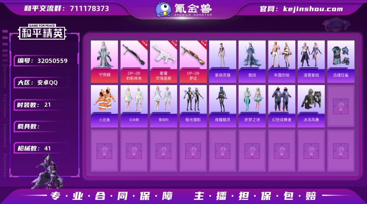 安卓 手Q-1粉装-3特效枪-0载具-0粉色飞行器-10216热力值-2王牌印记-21套装-41枪皮 【热门品类】:套装-小丑鱼 【粉色套装】:角色-宁雨蝶 【粉色枪皮等级】:蜜獾-荧海星豚(五级),DP-28-罗征(四级),DP-28-豹影疾电(五级) 【粉色枪皮】:蜜獾-荧海星豚,DP-28-罗征,DP-28-豹影疾电 【粉色降落伞】:冷漠罗丽降落伞,异瞳寒姬降落伞 【稀有套装】:套装-云朵鹅,套装-雪绒豹,套装-极光猎影,角色-夜瞳黯灵,套装-折梦之诗,套装-朱霞炽焰,套装-凌霄紫焰,角色-敖闰,角色-紫俏灵猫 【稀有枪皮】:AKM-极光猎影,SCAR-L-玉兔迎春,M762-奇异狩猎者,M762-云朵鹅,蜜獾-折梦之诗,ARX-凌霄紫焰,AKS-74U-极光猎影,JS9-凌霄紫焰,SKS-折梦之诗,Mini14-耀粉歌者,SVD-云朵鹅,SVD-冷漠罗丽,SPAS-12-钛晶裂爪,SPAS-12-云朵鹅,M249-糯团青竹,M249-绯穹魔姬,MG3-折梦之诗,MG-36-凌霄紫焰,P92-凌霄紫焰,蝎式手枪-蛇蝎美人,沙漠之鹰-云朵鹅,大砍刀-云朵鹅,撬棍-灵猫魔法师,平底锅-凌霄紫焰 【其他套装】:套装-幻世战舞者,套装-冰冻风暴,套装-迅捷狂鲨 【营地ID】:1005382387