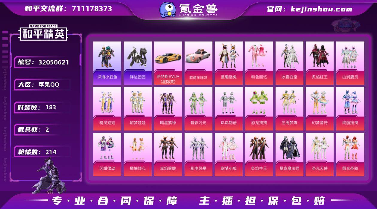 【特价出售/店主推荐】苹果 手Q-2神装-12粉装-6特效枪-1僚机-7载具-3粉色飞行器-32440热力值-2王牌印记-40套装-54枪皮 【红色神装等级】:最终圣卫者-帕修斯(一级),辉羽雀灵-初翊(三级) 【红色角色神装】:最终圣卫者-帕修斯,辉羽雀灵-初翊 【粉色套装】:粉装-齐天大圣,角色-凤凰座 一辉,角色-仙女座 瞬,角色-天鹅座 冰河,角色-天龙座 紫龙,角色-天马座 星矢,角色-智慧纱织,粉装-星穹咏叹调,角色-狂魅哈莉,角色-狂魇小丑,角色-冷漠罗丽,角色-天穹 【粉色枪皮等级】:AUG-圣斗士星矢(三级),UZI-圣斗士星矢(三级),Vector-最终圣卫者(三级),AKS-74U-星穹咏叹调(四级),Mk14-甜梦熊击(五级),MG3-辉羽雀灵(三级) 【粉色载具】:宝马i8(离子银),宝马M4(圣保罗黄),宝马X6 M(曼岛绿),迈凯伦塞纳(冷萃蓝),虚妄之影(炫耀紫),最终圣卫者摩托车,僚机-萌兔起飞,辉羽雀灵自行车 【粉色枪皮】:AUG-圣斗士星矢,UZI-圣斗士星矢,Vector-最终圣卫者,AKS-74U-星穹咏叹调,Mk14-甜梦熊击,MG3-辉羽雀灵 【粉色飞行器】:繁龙极客飞行器,雀灵庇佑飞行器,终晖之翼飞行器 【粉色降落伞】:繁龙极客降落伞,星穹咏叹调降落伞,辉羽雀灵降落伞,双重狂想降落伞,最终圣卫者降落伞,冷漠罗丽降落伞,宁雨蝶降落伞 【稀有套装】:套装-小鸟芋圆,套装-粉恋花,套装-紫幽梦,套装-蓝冰羽,套装-星影赞美诗,套装-星渊小夜曲,套装-极速光影,套装-彩虹兔,套装-云朵鹅,套装-雪绒豹,套装-诡诞巡游,套装-混沌火种,角色-时希公主 【稀有枪皮】:M16A4-最终圣卫者,M416-红色方程式,AUG-耀粉歌者,M762-萌物绒绒,M762-云朵鹅,G36C-星穹咏叹调,蜜獾-天降萌叽,蜜獾-御兔特攻,UZI-啾咪啾咪,UMP45-生命誓言,野牛-最终圣卫者,AKS-74U-辉羽雀灵,P90-宁雨蝶,Kar98k-最终圣卫者,Kar98K-星穹咏叹调...