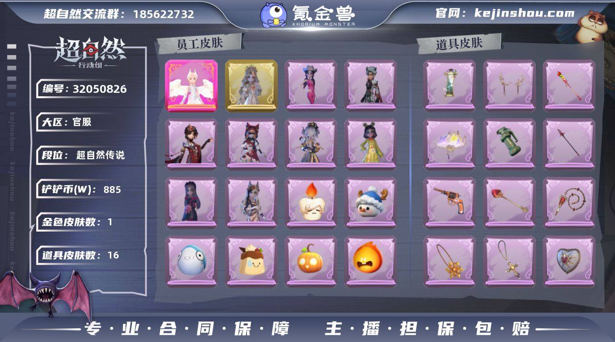 红皮1;金皮1;紫皮8;道具皮16;皮肤:小黄-炽天使,薇薇安-圣光之谕,莉莉-莓果陷阱,爱丽丝-耀眼的你,爱丽丝-丝缕哀歌,小黄-呱呱雨衣,艾伦-黎明猎手,薇薇安-白光莹,薇薇安-仙锋小姐,莉莉-除妖小师妹;道具:传送按钮-浮生一梦,闪光弹-金戈玄铜,腰包-宝剑八,急救包-蔷薇物语,折扇-赴此良宵,音响-鸣沙鼓,长枪-罪棘,额外的背包-飞花令,铲子-圣心之泪,长鞭-缚誓之锁,摸金符-花落精绝,喷气背包-乘风溯雪,摸金符-祝祷词,夜视仪-敛花容,转轮手枪-新星时代,长枪-糖葫芦霸王枪;饰品:头饰-小财神豚豚头套,头饰-卑微头套,头饰-雪墩墩头套,头饰-大葱明头套,头饰-萨卡班甲鱼头套,头饰-呆滞头套,头饰-火爆了头套,头饰-惊魂南瓜头套,头饰-烈焰红唇头套,头饰-太空鲨头套,头饰-滑稽头套,头饰-面具马头套,头饰-炙热烧烤,头饰-哈士奇头套,头饰-嘻嘻头套,头饰-烛光纪念,头饰-樱桃奶油布丁,头饰-鱼头怪头套,头饰-蒜了八,头饰-像素朋克墨镜,头饰-后室幸存者头套,挂饰-钗头凤,挂饰-晚安小熊,挂饰-拂云仙,挂饰-天使消失的年代,背饰-天使的呼唤;动作:动作-孤身摇,动作-九万字舞,动作-DL摇,动作-舞台中心,动作-心跳摇,动作-luvaboy,动作-抬手,动作-要糖,动作-带你逃跑吧,动作-蝴蝶步,动作-举牌;工牌背景:工牌背景-卷珠帘,工牌背景-童话扉页,工牌背景-永恒之阶,工牌背景-圣光之誓,工牌背景-永夜巡礼,工牌背景-雷霆轩,工牌背景-鸢尾花;工牌动作:工牌动作-虔诚之姿,工牌动作-轻躯鹤立;员工:爱丽丝,巫铃儿,小黄,小满,艾伦,零,爱德华,薇薇安,兰,逍遥,阿念,莉莉;累充946元;铲铲币88.5万;金砖0;段位:超自然传说17;魔盒等级:80;【巨人官方账号(唯一渠道)】【官方截图】