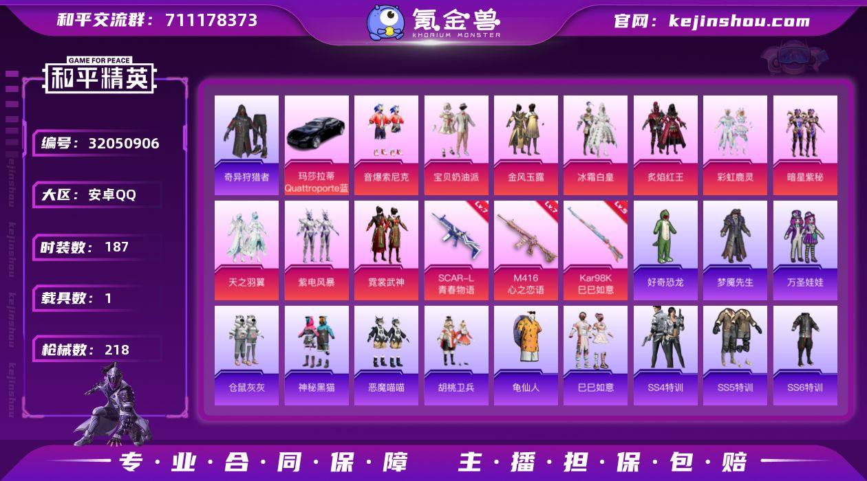 安卓 手Q-10粉装-3特效枪-1载具-2粉色飞行器-75807热力值-15王牌印记-187套装-218枪皮 【热门品类】:粉装-音爆索尼克,套装-奇异狩猎者,套装-龟仙人 【粉色套装】:粉装-宝贝奶油派,粉装-金风玉露,粉装-冰霜白皇,粉装-炙焰红王,粉装-彩虹鹿灵,粉装-暗星紫秘,粉装-天之羽翼,粉装-紫电风暴,粉装-霓裳武神,粉装-音爆索尼克 【粉色枪皮等级】:SCAR-L-青春物语(七级),M416-心之恋语(七级),Kar98K-巳巳如意(五级) 【粉色载具】:玛莎拉蒂Quattroporte(夜幕蓝) 【粉色枪皮】:SCAR-L-青春物语,M416-心之恋语,Kar98K-巳巳如意 【粉色飞行器】:庄周梦蝶飞行器,星夜魔法师飞行翼 【粉色降落伞】:至尊龙雀降落伞,星之信仰降落伞,金风玉露降落伞,马卡龙降落伞,童趣迷兔降落伞,香水柠檬降落伞,天之羽翼降落伞,冷魅冰骑降落伞,垂柳戏鸭降落伞,玉鳞金羽降落伞,忍者神龟降落伞,炫彩糖果降落伞 【稀有套装】:套装-龟仙人,套装-巳巳如意 【稀有枪皮】:AKM-冰凉西瓜,AKM-四圣焕新,AKM-夜灯,AKM-灼热熔岩,AKM-玉龙,AKM-生命誓言,AKM-缤纷海域,AKM-胡桃卫兵,AKM-霓虹街区,AKM-龙的传人,M16A4-幻世战舞者,M16A4-机械英豪,M16A4-甜心亚梦,M16A4-红色方程式,M16A4-蓝色火焰,M16A4-魔法学院,SCAR-L-炫彩节奏,SCAR-L-玉兔迎春,SCAR-L-甜蜜誓约,SCAR-L-生命誓言,SCAR-L-碧影闪光,SCAR-L-红色方程式,M416-夜灯,M416-神秘黑猫,M416-糯团青竹,M416-红色方程式,M416-绯红前夜,M416-蓝色火焰,GROZA-异彩先驱,GROZA-懵萌河马,GROZA-治愈之星,GROZA-田园牧歌,GROZA-黑色刀锋,AUG-天降萌叽,QBZ-原初圣火,QBZ-彩虹符号,QBZ-诡娃娃,QBZ-银碳小老虎,QBZ-飞驰魅影,M762-天降萌叽,M762-奇异狩猎者,M762-彩虹甜喵,M762-快乐主宰,M762-拳皇97,M762-牛气冲天,M762-诡娃娃,M...