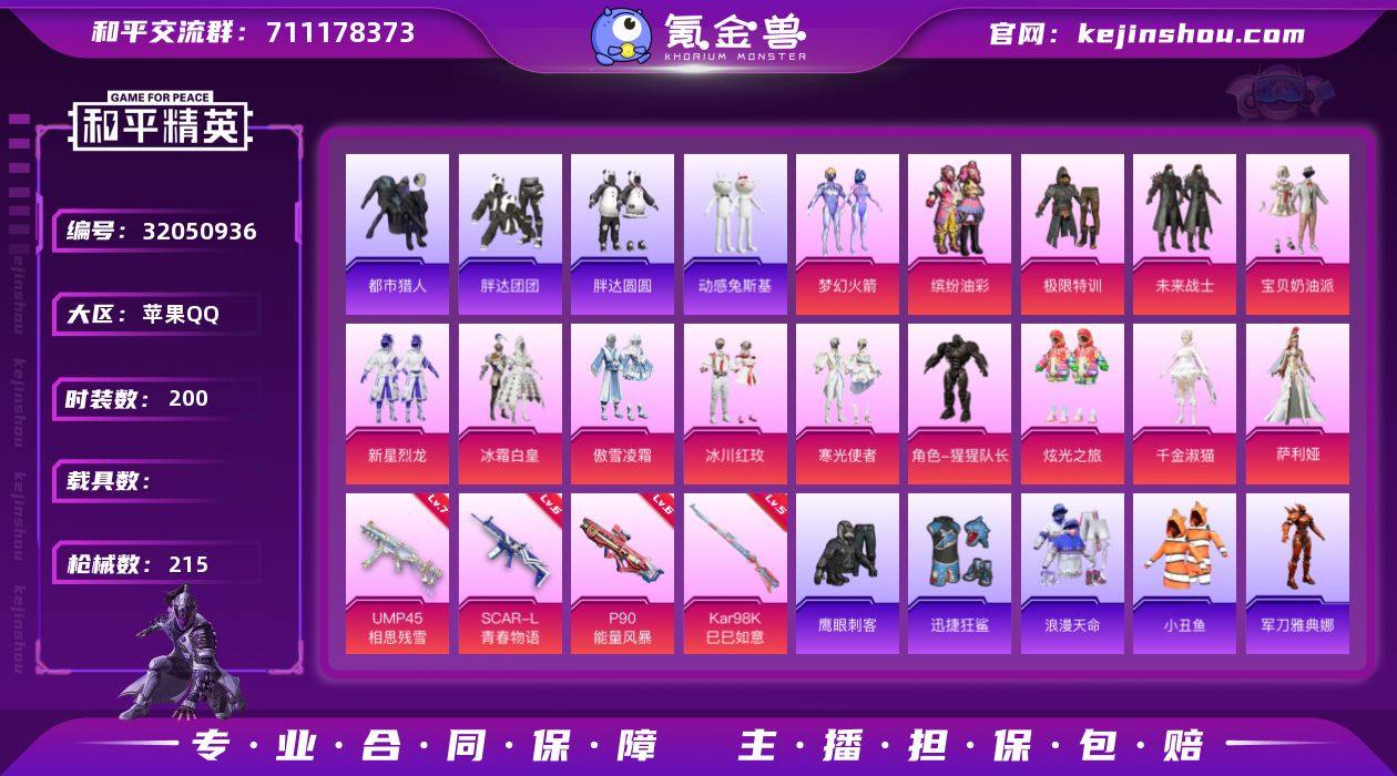 苹果 手Q-14粉装-4特效枪-0载具-2粉色飞行器-75127热力值-6王牌印记-200套装-215枪皮 【热门品类】:粉装-梦幻火箭,粉装-缤纷油彩,套装-浪漫天命,套装-都市猎人,套装-小丑鱼,角色-军刀雅典娜,套装-胖达团团,套装-胖达圆圆,套装-动感兔斯基人偶服,套装-AG战队服,套装-龟仙人,套装-暗影哥特,角色-Mark.06 【粉色套装】:粉装-极限特训,粉装-未来战士,粉装-宝贝奶油派,粉装-梦幻火箭,粉装-缤纷油彩,粉装-新星烈龙,粉装-冰霜白皇,粉装-傲雪凌霜,粉装-冰川红玫,粉装-寒光使者,角色-猩猩队长,粉装-炫光之旅,角色-千金淑猫,角色-萨利娅 【粉色枪皮等级】:SCAR-L-青春物语(六级),UMP45-相思残雪(七级),P90-能量风暴(六级),Kar98K-巳巳如意(五级) 【粉色枪皮】:SCAR-L-青春物语,UMP45-相思残雪,P90-能量风暴,Kar98K-巳巳如意 【粉色飞行器】:天之羽翼飞行器 【粉色降落伞】:幻影战神降落伞,百万伏特降落伞,粉色回忆降落伞,甜心宝贝降落伞,梦幻火箭降落伞,齐天大圣降落伞,绚金瑰梦降落伞,天之羽翼降落伞,恐龙拽拽降落伞,环太平洋降落伞,垂柳戏鸭降落伞,千面幻镜降落伞,海螺星光降落伞,圣堂之誓降落伞,绝色倾城降落伞,江南烟雨降落伞,霓虹漫游降落伞,精灵梦叶罗丽降落伞,初号机 觉醒Ver.降落伞,忍者神龟降落伞,脆鲨七海降落伞 【稀有套装】:套装-龟仙人,套装-巳巳如意,套装-雏菊兔兔,套装-萝兰蝴蝶,套装-小熊娃娃,套装-火种守卫者,套装-糖糖葫芦,套装-青团波波,套装-棉花软糖,套装-净心行者,角色-俏兔智灵,套装-燕燕于飞,套装-鱼渊荷华,玩偶服-小狗蛇点点,套装-蓝冰羽,套装-星渊小夜曲 【稀有枪皮】:AKM-墨染幽兰,AKM-彩虹符号,AKM-影袭,AKM-星之信仰,AKM-灼热熔岩,AKM-生命誓言,AKM-破晓战魂,AKM-缤纷海域,AKM-萌趣颜团子,AKM-龙的传人,...