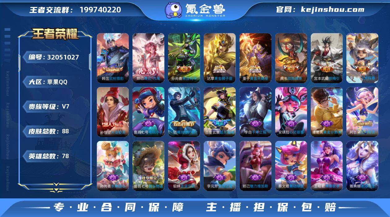九尾·弑枪猎影·至美化雀舞·战鼓燎原·惊梅引·诗剑行·黄金狮子座·可二次】w17905-苹果Q-78英雄-88皮肤-0王者印记-20铭文-贵族积分3w【贵族7】【1典藏·1无双·8传说·9按键】【因赛季更新游戏段付以上号为准!】 【荣耀典藏】:韩信弑枪猎影 【无双皮肤】:妲己青丘九尾 【传说皮肤】:墨子黄金天蝎座,典韦战鼓燎原,甄姬至美化雀舞,宫本武藏惊梅引,李白诗剑行,李元芳飞鸢探春,达摩黄金狮子座,孙尚香末日机甲 【限定皮肤】:赵云皇家上将,甄姬至美化雀舞,狄仁杰魔术师,达摩沙漠行僧,项羽海滩派对,孙悟空大圣娶亲,女娲朔望之晖,阿古朵江河有灵,张良古海寻踪,鬼谷子天穹祈灯,百里玄策超元猎域,鲁班七号蔬乡物语,李元芳蔬乡物语,刘邦剑破天穹 【赛季限定】:达摩沙漠行僧,张良古海寻踪,鬼谷子天穹祈灯,刘邦剑破天穹 【战令限定】:女娲朔望之晖,鲁班七号蔬乡物语,李元芳蔬乡物语 【史诗皮肤】:鲁班七号蔬乡物语,百里玄策超元猎域,阿古朵江河有灵,孙悟空大圣娶亲,李元芳逐浪之夏,蔡文姬舞动绿茵,铠曙光守护者,安琪拉心灵骇客,雅典娜冰冠公主,诸葛亮黄金分割率,李白千年之狐,刘禅绅士熊喵,妲己魅力维加斯,嬴政摇滚巨星,孙尚香水果甜心,狄仁杰魔术师,王昭君偶像歌手,甄姬冰雪圆舞曲,貂蝉圣诞恋歌,赵云皇家上将,鲁班七号电玩小子 【其他皮肤】:艾琳鹤鸣心笺,张良罗小黑战记,刘邦剑破天穹,扁鹊无尽旅途,李元芳蔬乡物语,鬼谷子天穹祈灯,后羿完美运算,张良古海寻踪,刘备潮玩造梦师,达摩沙漠行僧,盾山圆桌骑士,沈梦溪鲨炮海盗猫,女娲朔望之晖,孙尚香沉稳之力,关羽龙腾万里,刘备汉昭烈帝,刘备万事如意,张飞五福同心,花木兰兔女郎,亚瑟死亡骑士,妲己少女阿狸,姜子牙时尚教父,孙膑天使之翼,白起白色死神,项羽海滩派对,桑启画中游,云缨赤焰之缨,司空震启蛰,...