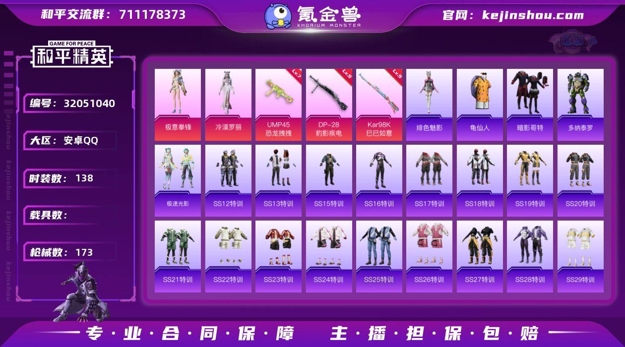 安卓 手Q-2粉装-3特效枪-0载具-1粉色飞行器-48557热力值-17王牌印记-138套装-173枪皮 【热门品类】:套装-龟仙人,套装-暗影哥特 【粉色套装】:角色-冷漠罗丽,粉装-极意拳锋 【粉色枪皮等级】:UMP45-恐龙拽拽(七级),Kar98K-巳巳如意(五级),DP-28-豹影疾电(五级) 【粉色枪皮】:UMP45-恐龙拽拽,Kar98K-巳巳如意,DP-28-豹影疾电 【粉色降落伞】:精灵梦叶罗丽降落伞,星穹咏叹调降落伞,喜羊羊与灰太狼降落伞,极意拳锋降落伞,炫彩糖果降落伞 【稀有套装】:套装-龟仙人,角色-多纳泰罗,套装-极速光影,角色-绯色魅影,套装-炫彩糖果 【稀有枪皮】:AUG-冰晶雪宝,AKM-彩虹符号,AKM-灼热熔岩,AKM-破晓战魂,AKM-萌趣颜团子,AKM-虎虎生威,AKM-龙的传人,M16A4-幻世战舞者,M16A4-甜心亚梦,M16A4-红色方程式,M16A4-蓝色火焰,SCAR-L-夜灯,SCAR-L-炫彩节奏,SCAR-L-玉兔迎春,SCAR-L-红色方程式,M416-糯团青竹,M416-红色方程式,M416-蓝色火焰,GROZA-彩虹符号,GROZA-田园牧歌,AUG-天降萌叽,AUG-耀粉歌者,QBZ-彩虹符号,QBZ-电玩视界,QBZ-飞驰魅影,M762-天降萌叽,M762-彩虹符号,M762-瑞龙福将,M762-绯红前夜,G36C-时空追击者,AC-VAL-天降萌叽,AC-VAL-甜心亚梦,蜜獾-天降萌叽,蜜獾-娇憨猪猪,UZI-啾咪啾咪,UZI-天降萌叽,UZI-娇憨猪猪,UZI-炫彩节奏,UZI-红色方程式,UMP45-夜灯,UMP45-时空追击者,UMP45-蓝色火焰,Vector-彩虹符号,Vector-暗夜玫瑰,Vector-生命誓言,Vector-田园牧歌,Vector-音爆索尼克,汤姆逊-奇异狩猎者,汤姆逊-炫彩节奏,汤姆逊-耀粉歌者,野牛-夜灯,AKS-74U-荧光像素,P90-飞驰魅影,P90-巳巳如意,Kar98K-彩虹符号,Kar98K-炫彩节奏,Kar98K-王子的夏天,Kar98K-红色方程式,Kar98K-飞驰魅影,M24-炫彩节奏,SKS-时空追击者,SKS-炫彩节奏,SKS-糯团青...