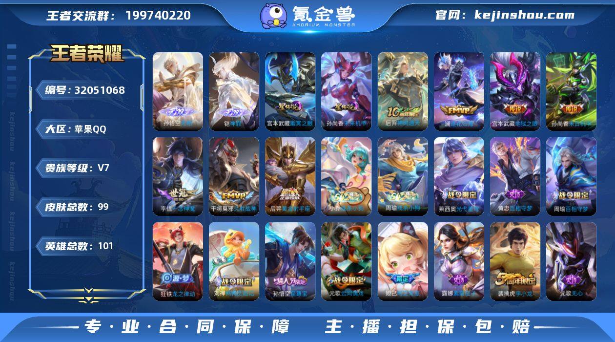贵族等级:V7 典藏皮肤数:0 珍品无双皮肤数:0 无双皮肤数:2 珍品传说皮肤数:0 传说皮肤数:7 史诗皮肤数:36 皮肤数:99 英雄数:101 段位:星耀 卖家说:价格好说