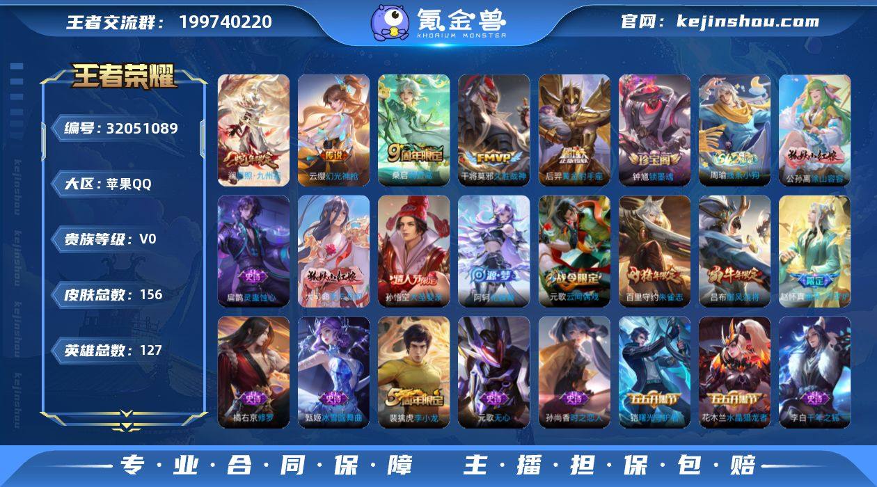 贵族等级:V0 典藏皮肤数:0 珍品无双皮肤数:0 无双皮肤数:0 珍品传说皮肤数:0 传说皮肤数:5 史诗皮肤数:50 皮肤数:156 英雄数:127 段位:星耀