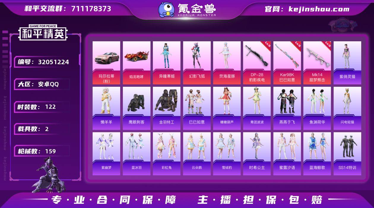 安卓 手Q-3粉装-3特效枪-2载具-1粉色飞行器-45746热力值-8王牌印记-122套装-159枪皮 【热门品类】:套装-金羽特工 【粉色套装】:粉装-幻影飞狐,角色-荧海星豚,角色-异瞳寒姬 【粉色枪皮等级】:Kar98K-巳巳如意(五级),Mk14-甜梦熊击(五级),DP-28-豹影疾电(五级) 【粉色载具】:玛莎拉蒂Ghibli(粉),焰龙咆哮 【粉色枪皮】:Kar98K-巳巳如意,Mk14-甜梦熊击,DP-28-豹影疾电 【粉色降落伞】:锦绣火鲤降落伞,碧影闪光降落伞,环太平洋降落伞,旋转彩虹降落伞,星际浪客降落伞,绝色倾城降落伞,鬼刀降落伞,幻影飞狐降落伞,幻彩电音降落伞,冷漠罗丽降落伞,荧海星豚降落伞,炫彩糖果降落伞 【稀有套装】:套装-巳巳如意,套装-糖糖葫芦,套装-青团波波,套装-燕燕于飞,套装-鱼渊荷华,套装-闪电轻猫,套装-紫幽梦,套装-蓝冰羽,套装-彩虹兔,套装-云朵鹅,套装-雪绒豹,角色-时希公主,套装-蜜露汐语,套装-蓝海鲸歌,玩偶服-懒羊羊,角色-紫俏灵猫,套装-炫彩糖果 【稀有枪皮】:AUG-冰晶雪宝,AKM-夜灯,AKM-环太平洋,AKM-破晓战魂,AKM-缤纷海域,AKM-虎虎生威,M16A4-幻世战舞者,M16A4-甜心亚梦,M16A4-红色方程式,M16A4-蓝色火焰,SCAR-L-夜灯,SCAR-L-玉兔迎春,SCAR-L-红色方程式,SCAR-L-冷漠罗丽,M416-红色方程式,M416-蓝色火焰,M416-黄金龙骨,GROZA-彩虹符号,GROZA-影袭,AUG-耀粉歌者,QBZ-飞驰魅影,M762-云朵鹅,AC-VAL-天降萌叽,AC-VAL-灵感创作师,AC-VAL-甜心亚梦,蜜獾-天降萌叽,蜜獾-娇憨猪猪,蜜獾-绯穹魔姬,UZI-娇憨猪猪,UZI-影袭,UZI-炫彩节奏,UZI-红色方程式,UZI-幻影飞狐,UMP45-夜灯,UMP45-蓝色火焰,Vector-彩虹符号,Vector-生命誓言,Vector-田园牧歌,汤姆逊-耀粉歌者,P90-飞驰魅影,P90-巳巳如意,Kar98K-炫彩节奏,Kar98K-红色方程式,Kar98K-飞驰魅影...