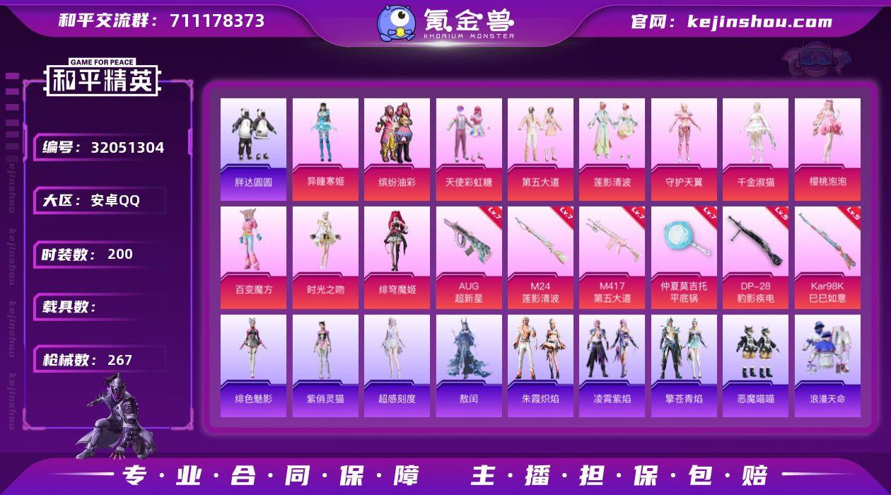 安卓 手Q-11粉装-6特效枪-0载具-8粉色飞行器-93808热力值-16王牌印记-200套装-267枪皮 【热门品类】:粉装-缤纷油彩,套装-浪漫天命,套装-胖达圆圆,角色-2P战斗服款,套装-龟仙人,角色-Mark.06 【粉色套装】:粉装-天使彩虹糖,粉装-缤纷油彩,粉装-第五大道,粉装-莲影清波,角色-守护天翼,角色-千金淑猫,角色-樱桃泡泡,粉装-百变魔方,角色-时光之吻,角色-绯穹魔姬,角色-异瞳寒姬 【粉色枪皮等级】:AUG-超新星(七级),Kar98K-巳巳如意(五级),M24-莲影清波(七级),M417-第五大道(七级),DP-28-豹影疾电(五级),平底锅-仲夏莫吉托(七级) 【粉色枪皮】:AUG-超新星,Kar98K-巳巳如意,M24-莲影清波,M417-第五大道,DP-28-豹影疾电,平底锅-仲夏莫吉托 【粉色飞行器】:星夜魔法师飞行翼,萌物绒绒飞行器,鎏金朋克飞行器,英伦信使飞行器,曦光华影飞行器,时光之誓飞行器 【粉色降落伞】:极限特训降落伞,粉色回忆降落伞,甜心宝贝降落伞,四圣焕新降落伞,青春物语降落伞,橘柚倾心降落伞,暖熊萌萌降落伞,千面幻镜降落伞,旋转彩虹降落伞,暗夜鎏金降落伞,音爆索尼克降落伞,第五大道降落伞,仲夏莫吉托降落伞,圣堂之誓降落伞,夜幕颂歌降落伞,江南烟雨降落伞,精灵梦叶罗丽降落伞,金丰海韵降落伞,未来领航者降落伞,绯果甜心降落伞,辉羽雀灵降落伞,无垠阁降落伞,喜羊羊与灰太狼降落伞,异瞳寒姬降落伞,极意拳锋降落伞,炫彩糖果降落伞 【稀有套装】:套装-龟仙人,套装-熊抱抱,套装-巳巳如意,角色-超感刻度,套装-雪国风尚,套装-雏菊兔兔,套装-萝兰蝴蝶,套装-小熊娃娃,角色-多纳泰罗,套装-火种守卫者,套装-糖糖葫芦,套装-青团波波,套装-棉花软糖,套装-燕燕于飞,套装-鱼渊荷华,套装-晶辉守护,套装-樱梦幻音,套装-粉恋花,套装-紫幽梦,套装-蓝冰羽,套装-星渊小夜曲,套装...