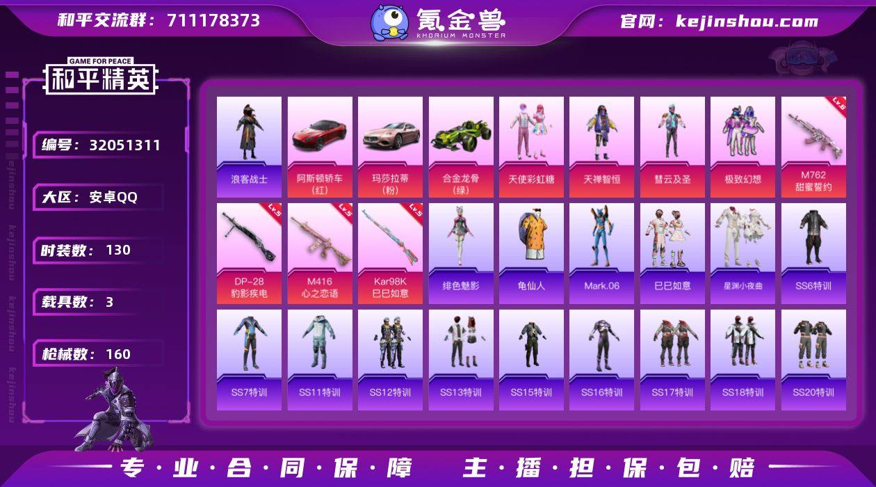 安卓 手Q-4粉装-4特效枪-3载具-0粉色飞行器-50107热力值-3王牌印记-130套装-160枪皮 【热门品类】:套装-浪客战士,套装-龟仙人,角色-Mark.06 【粉色套装】:粉装-天使彩虹糖,粉装-天禅智恒,粉装-彗云及圣,粉装-极致幻想 【粉色枪皮等级】:M416-心之恋语(五级),M762-甜蜜誓约(六级),Kar98K-巳巳如意(五级),DP-28-豹影疾电(五级) 【粉色载具】:阿斯顿马丁DBS(红),玛莎拉蒂Ghibli(粉),合金龙骨(绿) 【粉色枪皮】:M416-心之恋语,M762-甜蜜誓约,Kar98K-巳巳如意,DP-28-豹影疾电 【粉色降落伞】:甜心宝贝降落伞,甜蜜誓约降落伞,锦绣火鲤降落伞,怪笑疯兔降落伞,旋转彩虹降落伞,绯穹魔姬降落伞,异瞳寒姬降落伞 【稀有套装】:套装-龟仙人,套装-巳巳如意,套装-星渊小夜曲,角色-绯色魅影 【稀有枪皮】:AKM-彩虹符号,AKM-玉龙,AKM-萌趣颜团子,AKM-虎虎生威,AKM-龙的传人,M16A4-夜灯,M16A4-幻世战舞者,M16A4-机械英豪,M16A4-红色方程式,SCAR-L-炫彩节奏,SCAR-L-玉兔迎春,SCAR-L-繁花小夜曲,SCAR-L-黄金龙骨,M416-绯红前夜,GROZA-彩虹符号,GROZA-黑色刀锋,AUG-天降萌叽,AUG-耀粉歌者,AUG-青春冒险家,QBZ-原初圣火,QBZ-彩虹符号,QBZ-神秘黑猫,M762-天降萌叽,M762-瑞龙福将,M762-甜心宝贝,M762-绯红前夜,M762-镭射皇者,Mk47-妙红点点,Mk47-青春冒险家,AC-VAL-天降萌叽,蜜獾-天降萌叽,蜜獾-娇憨猪猪,UZI-啾咪啾咪,UZI-天降萌叽,UZI-娇憨猪猪,UZI-炫彩节奏,UZI-生命誓言,UZI-月影灵韵,UMP45-仲夏莫吉托,UMP45-夜灯,UMP45-生命誓言,Vector-生命誓言,Vector-音爆索尼克,汤姆逊-天降萌叽,野牛-机械英豪,野牛-青春冒险家,MP5K-怪笑疯兔,MP5K-繁花小夜曲,Kar98K-欢乐麻酱,Kar98K-红色方程式,Kar98K-星穹咏叹调,M24-激战未来,SKS-心之恋语,SKS-浪...