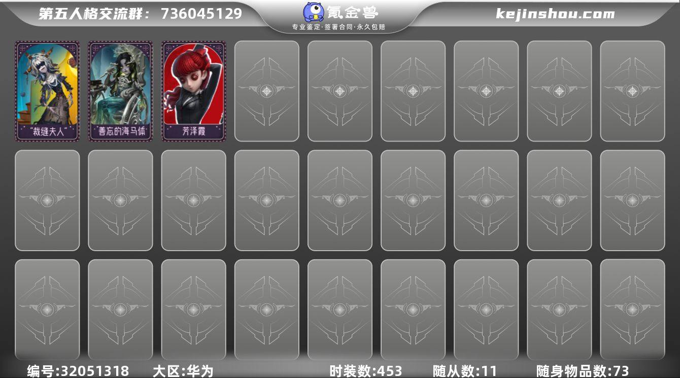 453时装14金81紫11随从73随身物品 ✅【XTR0045】 ✅区服:华为账号未设置✅登入方式:手机号 ✅金皮数量:14✅热门金:倒逆之汞,薄金,星之王,记忆的沉疴,竹华,花序,怪鸟初晴,胧夜,椰香假日,鬼烛,长夜,欧律狄刻,片刻闲暇 ✅紫皮数量:81✅热门紫:奥村春,佐仓双叶,NAVI,芳泽霞,兰闺惊梦,红菱艳,菲丽丝,克拉拉,牛仔-船影,裁缝夫人,逐浪的玫瑰,潘塔龙,多加雷萨,善忘的海马体,多色印刷,收藏品