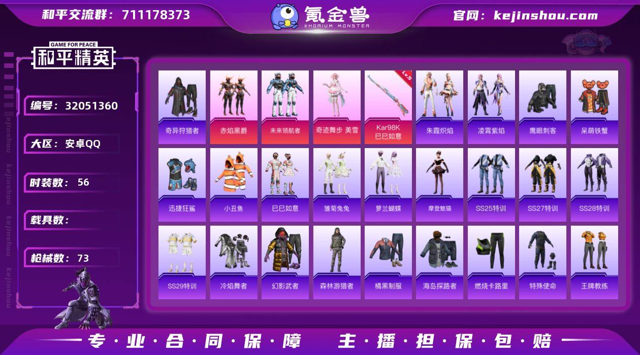 安卓 手Q-3粉装-1特效枪-0载具-1粉色飞行器-20305热力值-1王牌印记-56套装-73枪皮 【热门品类】:套装-小丑鱼,套装-奇异狩猎者 【粉色套装】:粉装-赤焰黑爵,粉装-未来领航者,角色-奇迹舞步 美雪 【粉色枪皮等级】:Kar98K-巳巳如意(五级) 【粉色枪皮】:Kar98K-巳巳如意 【粉色飞行器】:萌物绒绒飞行器 【粉色降落伞】:幻影战神降落伞,春暖花开降落伞,童趣迷兔降落伞,冷魅冰骑降落伞,守护天翼降落伞,初号机 觉醒Ver.降落伞,临安公主降落伞 【稀有套装】:套装-巳巳如意,套装-雏菊兔兔,套装-萝兰蝴蝶,角色-摩登魅猫,套装-朱霞炽焰,套装-凌霄紫焰 【稀有枪皮】:AKM-破晓战魂,SCAR-L-粉锦千层,M416-摩登王国,M416-糯团青竹,M416-蓝色火焰,AUG-天降萌叽,AUG-耀粉歌者,蜜獾-天降萌叽,ARX-凌霄紫焰,UZI-天降萌叽,UMP45-蓝色火焰,汤姆逊-天降萌叽,JS9-凌霄紫焰,P90-巳巳如意,SKS-炫彩节奏,SKS-迅猛狂鲨,Mini14-炫彩节奏,Mini14-穿刺龙虾,M417-惊鸿侠骨,M200-惊鸿侠骨,S686-生命誓言,S686-巳巳如意,S686-千金淑猫,M249-冷魅冰骑,M249-彩虹符号,DP-28-彩虹符号,MG3-惊鸿侠骨,MG-36-凌霄紫焰,P92-凌霄紫焰,短管霰弹-竹节火铳,爆炸猎弓-惊鸿侠骨,平底锅-绝色倾城,平底锅-凌霄紫焰,破片手榴弹-巳巳如意 【其他套装】:套装-SS25特训,套装-SS27特训,套装-SS28特训,套装-SS29特训,套装-冷焰舞者,套装-幻影武者,套装-森林游猎者,套装-橘黑制服,套装-海岛探路者,套装-燃烧卡路里,套装-特殊使命,套装-王牌教练,套装-竞技名士,套装-绮丽涂鸦,套装-蓝彩潮人,套装-街头潮人,套装-青涩时光,套装-魅力单车,套装-特战英豪,套装-鹰眼刺客,套装-奇异狩猎者,套装-蓝调潮人,套装-清新柠檬,套装-呆萌铁蟹,套装-迅捷狂鲨,套装-惊鸿侠骨,套装-锦衣飞扬,套装-晨曦...