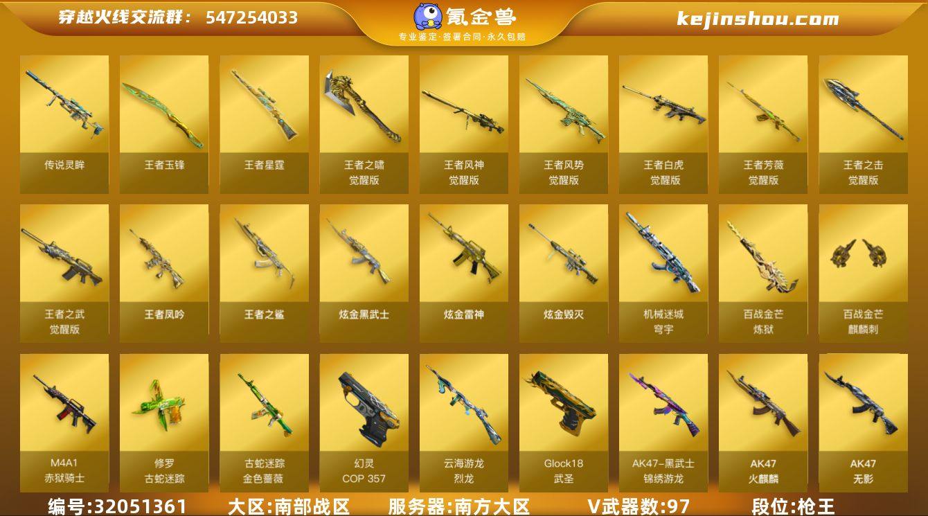 南方大区-111V-17王者武器数-4炫金武器数 【传说武器】:传说灵眸 【热门武器】:传说灵眸,G36C-幻影,QBZ03-金色蔷薇*2,M14EBR-玄武,M4A1-青龙,M200-幻神,金色蔷薇-古蛇迷踪,修罗-古蛇迷踪,白虎-电玩蓝兔,Kar98K-星神,毒蜂*2,M4A1-黑骑士,汤姆逊-烈龙*5,COP-白鲨,COP 357-幻灵*2,沙鹰-修罗*7,炽芒蝶刃*2 【王者炫金武器】:王者之鲨*2,王者凤吟,王者星霆,王者玉锋,炫金雷神,炫金武士*2,炫金毁灭 【音效卡】:屠龙-动感闪耀 音效卡,修罗-云海游龙音效卡,Barrett-极光音效卡,QBZ03-金色蔷薇音效卡,白鲨语音包,N9语音包,炼狱-百战金芒-庆典舞曲音效卡 【皮肤】:M200-幻神-荣耀世冠白鲨,幻神-动感闪耀 皮肤,幻神-电流骇客 皮肤,QBZ03-冠军之薇,QBZ03-荣耀世冠白鲨*2,QBZ03-金色蔷薇-斗鱼皮肤,裁决-流光秘银,裁决-羽掣 皮肤,裁决-运输船 皮肤,星神-璀璨皮肤,雷神-暗月,雷神-荣耀之魄,雷神-星空,雷神-传奇N9,雷神-维纳斯皮肤,雷神-源计划2.0专属 皮肤,雷神-化蛇 皮肤,雷神-诺拉 皮肤,M4A1-再燃火线,雷神-神秘按键 皮肤,传奇石头-横秒之巅,火麒麟-平天大圣,火麒麟-百城,毁灭-冠军之怒,毁灭-黑大圣皮肤,毁灭-航天科技皮肤,毁灭-英雄计划 皮肤,M4A1-黑龙-361,黑骑士耀金皮肤*2,无影耀金皮肤,无影-霓裳皮肤,黑武士-典韦皮肤,Barrett-金色蔷薇-蛇姬 皮肤,炼狱-星空,修罗-冠军之魂*3,屠龙-荣耀之锋*2,屠龙-荣耀世冠AG,屠龙-星火燎原,屠龙-春桃 皮肤,屠龙-惊鸿 皮肤,龙啸-蛇姬 皮肤,轻型军用手斧-再燃火线 【角色】:影豹,月兔特工,关小雨,王者-瞳-闭月羞花,王者-零-国色天香,王者复仇,王者涂鸦,王者影豹,王者-救世主,王者潘多拉,王者沙漠玫瑰,蛇隐宗,乔伊教练,云海玲珑,葵-阿尔法武装,暗夜-X,初恋灵狐,电竞少女,风暴女,疾风,兰-新...