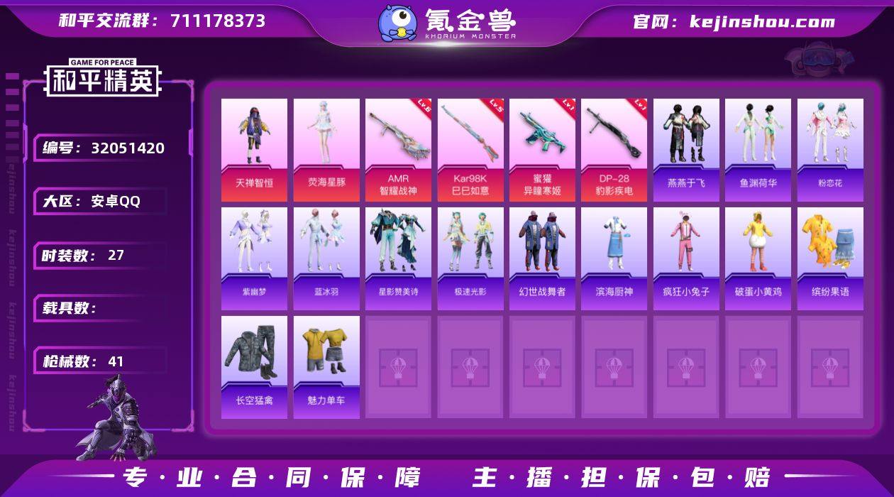 安卓 手Q-2粉装-4特效枪-0载具-0粉色飞行器-11560热力值-4王牌印记-27套装-41枪皮 【粉色套装】:粉装-天禅智恒,角色-荧海星豚 【粉色枪皮等级】:蜜獾-异瞳寒姬(一级),Kar98K-巳巳如意(五级),AMR-智耀战神(六级),DP-28-豹影疾电(一级) 【粉色枪皮】:蜜獾-异瞳寒姬,Kar98K-巳巳如意,AMR-智耀战神,DP-28-豹影疾电 【粉色降落伞】:繁龙极客降落伞,智耀战神降落伞,星穹咏叹调降落伞 【稀有套装】:套装-燕燕于飞,套装-鱼渊荷华,套装-粉恋花,套装-紫幽梦,套装-蓝冰羽,套装-星影赞美诗,套装-极速光影 【稀有枪皮】:G36C-星穹咏叹调,UZI-啾咪啾咪,汤姆逊-天降萌叽,P90-巳巳如意,SKS-炫彩节奏,SKS-迅猛狂鲨,S12K-玩趣呆呆,DBS-彩虹符号,MG3-幻世战舞者,MG3-智耀战神,大砍刀-鬼刀 【其他套装】:套装-幻世战舞者,套装-滨海厨神,套装-疯狂小兔子,套装-破蛋小黄鸡,套装-缤纷果语,套装-长空猛禽,套装-魅力单车 【稀有背包】:深海小丑鱼背包(1级) 【营地ID】:983274360