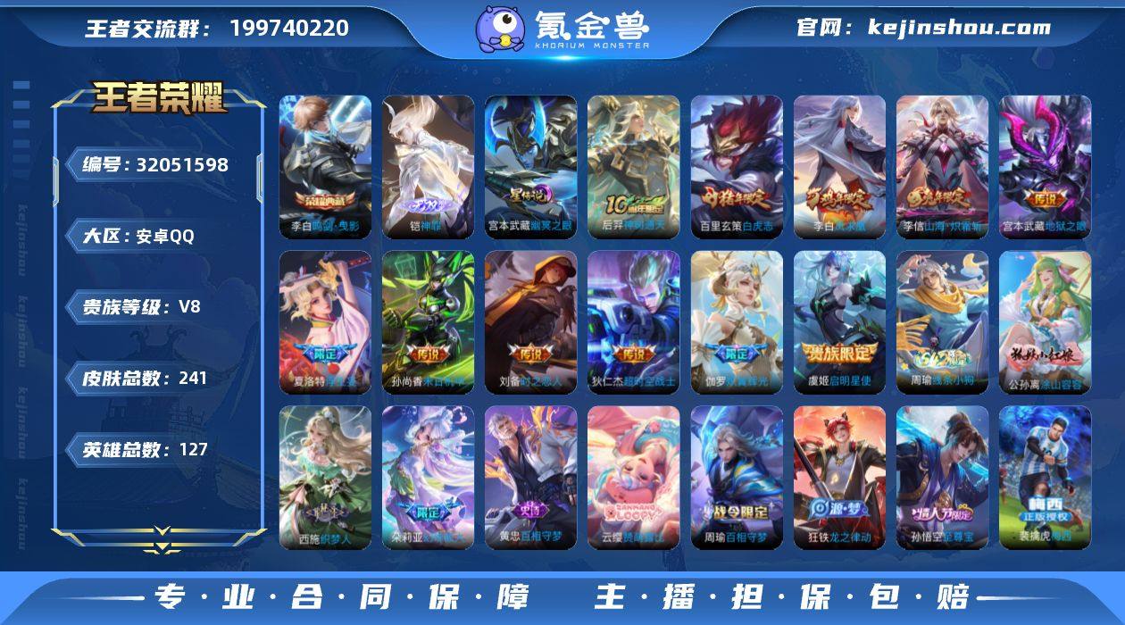 安卓Q-V8-最强王者段位-金标1w典韦-127英雄-241皮肤-1典藏皮肤-1无双-10传说-54史诗【英雄全皮】:孙权全皮,空空儿全皮【荣耀典藏】:李白鸣剑曳影【无双皮肤】:铠神罪【传说皮肤】:后羿神树通天,夏洛特浮生妄,伽罗炽翼辉光,李信山海炽霜斩,虞姬启明星使,百里玄策白虎志,李白凤求凰,孙尚香末日机甲,宫本武藏地狱之眼,狄仁杰超时空战士【限定皮肤】:白起狰,狄仁杰阴阳师,虞姬凯尔特女王,赵云皇家上将,嬴政白昼王子,庄周蜃楼王,高渐离死亡摇滚,孙膑妖精王,扁鹊炼金王,芈月重明,吕布猎兽之王,元歌云间偶戏,夏侯惇朔风刀,甄姬游园惊梦,曹操烛龙,典韦穷奇,典韦蓝屏警告,狄仁杰魔术师,狄仁杰万华元夜,达摩沙漠行僧,项羽海滩派对,老夫子醍醐杖,关羽冰锋战神,程咬金演武夺筹,韩信逐梦之影,兰陵王金庭之子,花木兰瑞麟志,亚瑟狮心王,孙悟空至尊宝,孙悟空大圣娶亲,牛魔御旌,后羿辉光之辰,虞姬启明星使,钟馗驱傩正仪,杨玉环遇见飞天,女娲朔望之晖,雅典娜黎明之约,太乙真人饕餮,太乙真人华丽摇滚,鬼谷子原初探秘者,铠青龙志,百里玄策白虎志,弈星混沌棋,公孙离蜜橘之夏,沈梦溪大漠名商,明世隐疑决卦,裴擒虎李小龙,狂铁御狮,米莱狄御霄,李信山海炽霜斩,伽罗炽翼辉光,盾山御銮,鲁班大师探海日志,桑启海盐诗旅,夏洛特浮生妄,裴擒虎梅西,姬小满妄想食味,沈梦溪龙舞盛年【年限皮肤】:李白凤求凰,后羿辉光之辰,花木兰瑞麟志,百里玄策白虎志,铠青龙志,李信山海炽霜斩【赛季限定】:亚瑟狮心王,庄周蜃楼王,孙膑妖精王,扁鹊炼金王,虞姬凯尔特女王,白起狰,太乙真人饕餮,曹操烛龙,芈月重明,典韦穷奇,狂铁御狮,米莱狄御霄,牛魔御旌,盾山御銮,夏侯惇朔风刀,弈星混沌棋,明世隐疑决卦,老夫子醍醐杖,鬼谷子原初探秘者,狄仁杰万华元夜,程咬金演...
