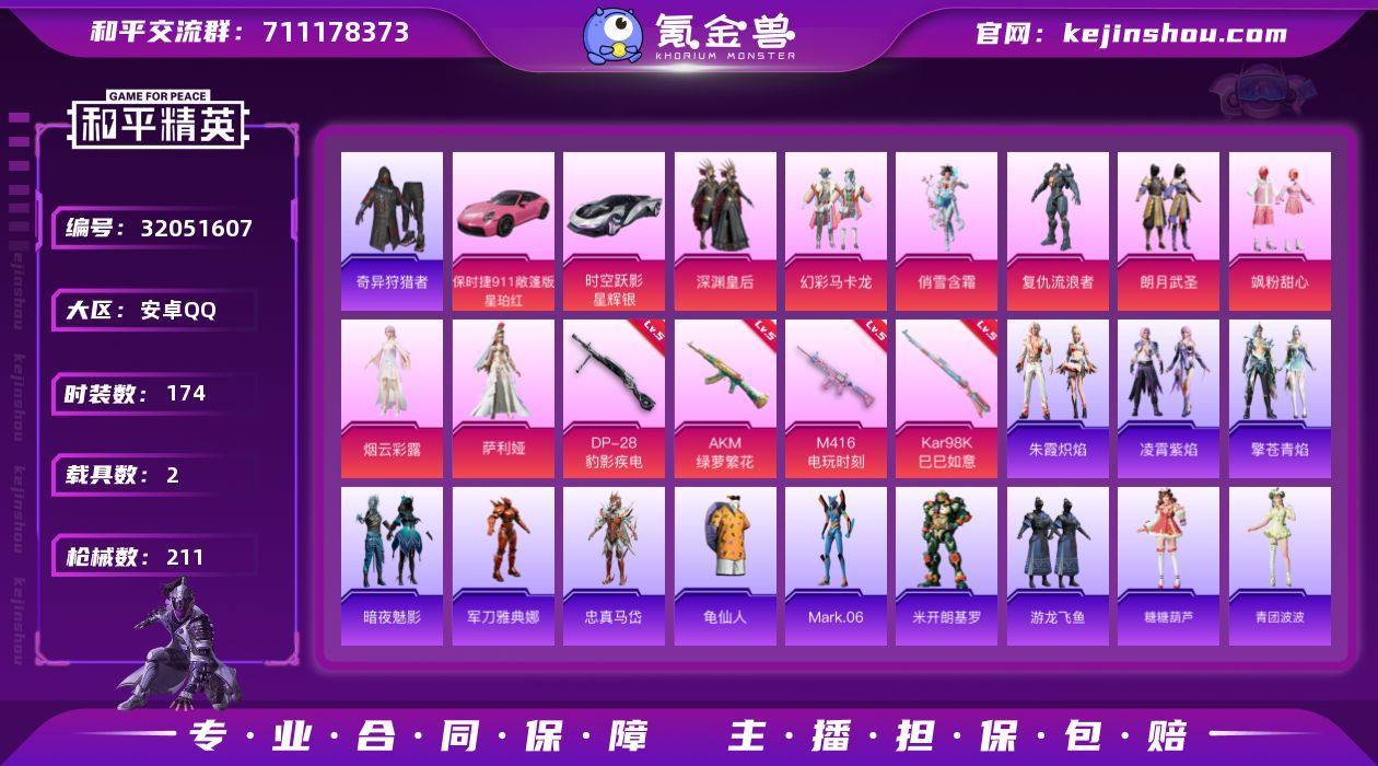 安卓 手Q-8粉装-4特效枪-2载具-2粉色飞行器-73955热力值-4王牌印记-174套装-211枪皮 【热门品类】:套装-奇异狩猎者,角色-军刀雅典娜,角色-忠真马岱,套装-龟仙人,角色-Mark.06 【粉色套装】:粉装-深渊皇后,粉装-幻彩马卡龙,粉装-俏雪含霜,角色-复仇流浪者,粉装-朗月武圣,粉装-飒粉甜心,角色-烟云彩露,角色-萨利娅 【粉色枪皮等级】:AKM-绿萝繁花(五级),M416-电玩时刻(五级),Kar98K-巳巳如意(五级),DP-28-豹影疾电(五级) 【粉色载具】:时空跃影(星辉银),保时捷911 敞篷版(星珀红) 【粉色枪皮】:AKM-绿萝繁花,M416-电玩时刻,Kar98K-巳巳如意,DP-28-豹影疾电 【粉色飞行器】:星夜魔法师飞行翼,英伦信使飞行器 【粉色降落伞】:幻影战神降落伞,凝视深渊降落伞,PEL轰鸣竞梦者降落伞,神秘黑猫降落伞,古堡领主降落伞,花间之火降落伞,锦绣火鲤降落伞,天之羽翼降落伞,炙焰牛王降落伞,垂柳戏鸭降落伞,苔丝玫瑰降落伞,仲夏莫吉托降落伞,炫光之旅降落伞,莲影清波降落伞,龙行天下降落伞,精灵梦叶罗丽降落伞,创世·救赎降落伞,守护天翼降落伞,金丰海韵降落伞,宇宙意志降落伞,绯穹魔姬降落伞,喜羊羊与灰太狼降落伞,炫彩糖果降落伞 【稀有套装】:套装-龟仙人,角色-米开朗基罗,套装-游龙飞鱼,套装-糖糖葫芦,套装-青团波波,套装-棉花软糖,角色-都市丽猫,套装-鱼渊荷华,角色-风玲,角色-绛羽幽主,套装-朱霞炽焰,套装-凌霄紫焰,套装-擎苍青焰 【稀有枪皮】:AKM-2P战斗服款,AKM-奇异狩猎者,AKM-彩虹符号,AKM-恐龙拽拽,AKM-海渊国主,AKM-灼热熔岩,AKM-玉龙,AKM-环太平洋,AKM-破晓战魂,AKM-虎虎生威,AKM-龙的传人,M16A4-凝视深渊,M16A4-幻世战舞者,M16A4-甜心亚梦,M16A4-红色方程式,M16A4-莲影清波,M16A4-千金淑猫,SCAR-L-凝视深渊,SCAR-L-炫彩节奏,SC...