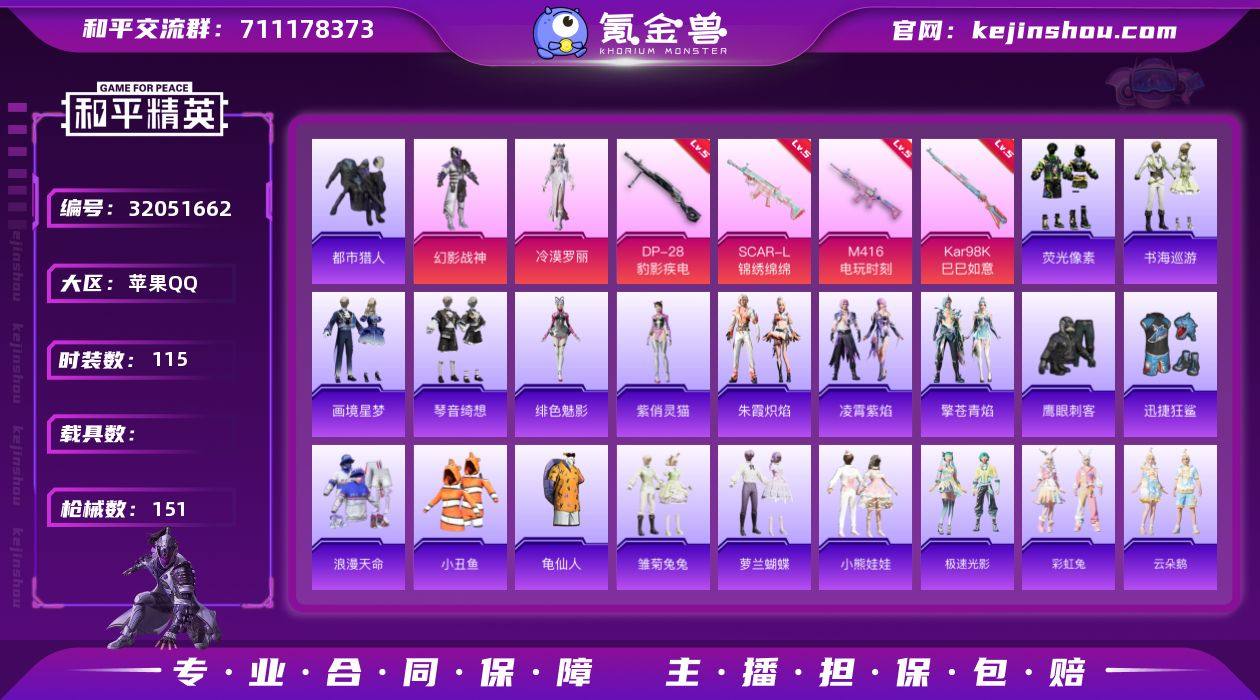 【mhp1165】苹果 手Q-2粉装-6特效枪-0载具-2粉色飞行器-38258热力值-7王牌印记-115套装-151枪皮 【热门品类】:套装-浪漫天命,套装-都市猎人,套装-小丑鱼,套装-龟仙人 【粉色套装】:粉装-幻影战神,角色-冷漠罗丽 【粉色枪皮等级】:SCAR-L-锦绣绵绵(五级),M416-电玩时刻(五级),Kar98K-巳巳如意(五级),Mk14-福马献瑞(五级),AA12-G-萌骑幻想(五级),DP-28-豹影疾电(五级) 【粉色枪皮】:SCAR-L-锦绣绵绵,M416-电玩时刻,Kar98K-巳巳如意,Mk14-福马献瑞,AA12-G-萌骑幻想,DP-28-豹影疾电 【粉色飞行器】:炫彩糖果飞行器,极意拳锋飞行器 【粉色降落伞】:幻影战神降落伞,星夜魔法师降落伞,萌物绒绒降落伞,江南烟雨降落伞,精灵梦叶罗丽降落伞,星穹咏叹调降落伞,异瞳寒姬降落伞,炫彩糖果降落伞 【稀有套装】:套装-龟仙人,套装-荧光像素,套装-雪国风尚,套装-炫彩糖果,套装-马上有钱,套装-雏菊兔兔,套装-萝兰蝴蝶,套装-小熊娃娃,套装-极速光影,套装-彩虹兔,套装-云朵鹅,套装-雪绒豹,套装-朱霞炽焰,套装-凌霄紫焰,套装-擎苍青焰,角色-绯色魅影,角色-紫俏灵猫,套装-书海巡游,套装-画境星梦,套装-琴音绮想 【稀有枪皮】:AUG-冰晶雪宝,AKM-影袭,AKM-破晓战魂,AKM-缤纷海域,M16A4-幻世战舞者,M416-蓝色火焰,GROZA-影袭,AUG-幻影战神,AUG-耀粉歌者,QBZ-彩虹符号,M762-天降萌叽,M762-暖熊萌萌,M762-云朵鹅,M762-登顶巅峰,G36C-星穹咏叹调,AC-VAL-天降萌叽,蜜獾-天降萌叽,ACE32-画境星梦,ARX-凌霄紫焰,UZI-天降萌叽,UZI-影袭,UZI-金玉无双,UMP45-快乐主宰,UMP45-生命誓言,UMP45-金玉无双,Vector-焰鹰斗篷,MP5K-画境星梦,AKS-74U-荧光像素,JS9-凌霄紫焰,Kar98K-彩虹符号,Kar98K-影袭,M24-影袭,AWM-焰鹰斗篷,SKS-迅猛狂鲨,SKS-金玉无双,Mini14-穿刺龙...