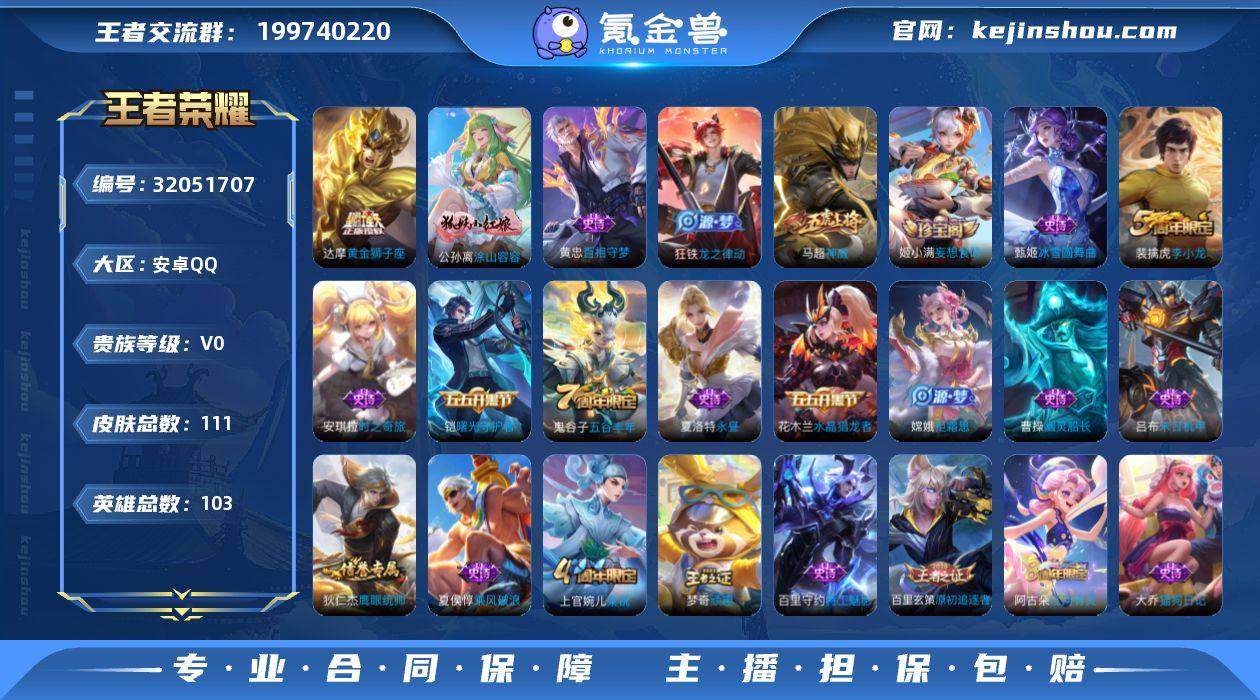 贵族等级:V0 典藏皮肤数:0 珍品无双皮肤数:0 无双皮肤数:0 珍品传说皮肤数:0 传说皮肤数:1 史诗皮肤数:37 皮肤数:111 英雄数:103 段位:钻石 卖家说:7金标 6万战