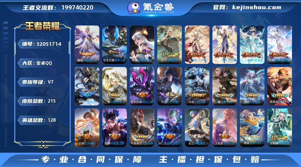 安卓Q-V7-至尊星耀IV段位-128英雄-215皮肤-1典藏皮肤-19传说-58史诗【英雄全皮】:孙权全皮,苍全皮【荣耀典藏】:虞姬神鉴启示录【传说皮肤】:后羿神树通天,司空震愿照山河定,女娲愿照千秋盛,妲己愿照众生和,澜愿照九州拓,云缨幻光神枪,裴擒虎祥瑞亨通,夏侯惇霜北刀,马超无双飞将,赵云淬星耀世,王昭君乞巧织情,西施游龙清影,镜炽阳神光,曜云鹰飞将,李信一念神魔,干将莫邪久胜战神,貂蝉仲夏夜之梦,宫本武藏地狱之眼,狄仁杰超时空战士【限定皮肤】:夏侯惇霜北刀,暃埋骨钱,蒙犽顽岩魄,蔡文姬夏日便利店,虞姬夏日便利店,姜子牙天穹之誓,杨戬破阵退雄兵,狄仁杰阴阳师,赵云皇家上将,鲁班七号狮舞东方,扁鹊奇幻香踪,元歌无心,马可波罗山海玄木吟,狄仁杰魔术师,项羽海滩派对,兰陵王驯魔猎人,孙悟空孙行者,裴擒虎擒涛扼浪,西施玲珑珍味,鲁班大师探海日志,桑启海盐诗旅,戈娅驭风魔法,张良古海寻踪,鬼谷子天穹祈灯,沈梦溪龙舞盛年,刘邦剑破天穹,程咬金群星魔术团,镜青焰无极,项羽苍威无极,芈月浮光幕影,周瑜熔金海岸【年限皮肤】:马可波罗山海玄木吟,司空震愿照山河定,女娲愿照千秋盛,妲己愿照众生和,澜愿照九州拓【赛季限定】:桑启海盐诗旅,裴擒虎擒涛扼浪,鲁班大师探海日志,张良古海寻踪,鬼谷子天穹祈灯,刘邦剑破天穹,姜子牙天穹之誓,东皇太一噬灭天穹,太乙真人谧流熔炉,钟馗虚灵犬护,亚瑟荣光之誓,牛魔星界战将【战令限定】:鲁班七号狮舞东方,兰陵王驯魔猎人,扁鹊奇幻香踪,戈娅驭风魔法,西施玲珑珍味,镜青焰无极,项羽苍威无极,蔡文姬夏日便利店,虞姬夏日便利店,百里守约百相守梦,老夫子百相守梦,孙膑茶境仙,马超访茗客,刘禅鸭鸭历险记,沈梦溪鸭鸭历险记,莱西奥光弋星穹,明世隐往忆晖光,周瑜线条小狗【史诗皮肤】:盘古撼世英歌,...