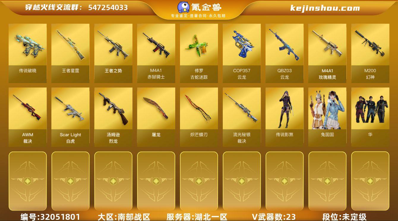 湖北一区-24V-2王者武器数-0炫金武器数 【传说武器】:传说破晓 【传说角色】:传说影煞 【热门武器】:传说破晓,Scar Light-白虎,M200-幻神,修罗-古蛇迷踪,汤姆逊-烈龙*5,炽芒蝶刃 【王者炫金武器】:王者之势,王者星霆 【皮肤】:裁决-流光秘银,裁决-羽掣 皮肤,屠龙-星火燎原 【角色】:华,蛇隐宗,芳心审判者,零-水下丽影,蛇姬,兔囡囡 【人偶武器】:迷你深渊冰龙,迷你牛牛,迷你生化手雷,生化手雷-机甲核心 【暴走生化】:超级对讲机 【英雄级武器】:Scar Light-白虎,QBZ03-云龙,M4A1-玫瑰精灵,AWM-裁决,M200-幻神,汤姆逊-烈龙*5,COP 357-云龙,修罗-古蛇迷踪,屠龙,炽芒蝶刃,高爆手雷-云龙*2,高爆手雷-古蛇迷踪,闪光弹-云龙*2,烟雾弹-云龙*2,烟雾弹-古蛇迷踪,M4A1-赤狱骑士 【道具】:亚洲杯纪念炫彩背包,古蛇迷踪炫彩背包,超级背包,地狱终结者-妲己,救世主-黑桃战神,黄金生化钩,绿色巨人,灵魂忍者,迷雾幽灵,夺命之镰,防化服*2,流光-再燃火线,枪王排位28赛季金色流光,枪王排位29赛季金色流光,古蛇迷踪打击特效,蛇隐宗表情,C4-红龙,防弹头盔*2,防弹衣*2,C4工具钳*2,手雷包*2 【特殊枪械】:1白虎,5烈龙