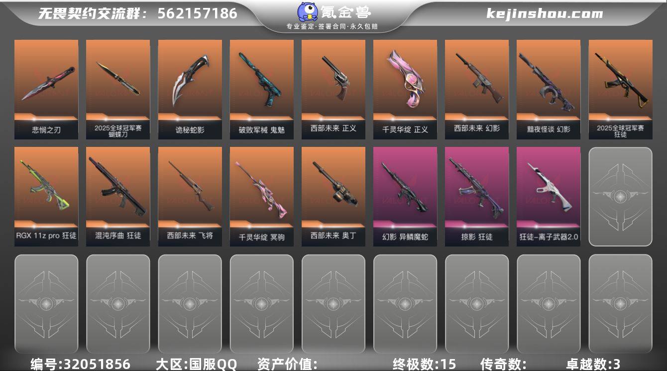 【套装】:2025全球冠军赛套装,无畏契约季前邀请赛套装,西部未来套装【英雄】:幻棱,炼狱,维斯,暮蝶,钛狐,壹决,铁臂,捷风,雷兹,幽影,不死鸟,贤者,猎枭,蝰蛇,零,芮娜,奇乐,尚勃勒,霓虹,斯凯,夜露,星礈,K/O,海神,盖可,黑梦,钢锁【近战武器】:近战武器-2025全球冠军赛 蝴蝶刀,近战武器-无畏契约季前邀请赛 悲悯之刃,近战武器-未来开拓者,近战武器-诡秘蛇影 军刀【狂徒】:狂徒-2025全球冠军赛,狂徒-混沌序曲,狂徒-RGX 11z Pro,狂徒-掠影,狂徒-离子武器//2.0,狂徒-诡秘蛇影【幻影】:幻影-黯夜怪谈,幻影-西部未来,幻影-异鳞魔蛇,幻影-神圣领域,幻影-末日之翼,幻影-西部未来【戍卫】:戍卫-折光棱晶【冥驹】:冥驹-千灵华绽【飞将】:飞将-西部未来,飞将-末日之翼【莽侠】:莽侠-诡秘蛇影,莽侠-月球哨兵【战神】:战神-神圣领域【奥丁】:奥丁-西部未来,奥丁-末日之翼【判官】:判官-诡秘蛇影【雄鹿】:雄鹿-月球哨兵【骇灵】:骇灵-无限竞技,骇灵-星云暗涌【蜂刺】:蜂刺-星云暗涌,蜂刺-折光棱晶【标配】:标配-超能偶像,标配-折光棱晶【正义】:正义-千灵华绽,正义-西部未来,正义-月球哨兵【鬼魅】:鬼魅-破败军械,鬼魅-诡秘蛇影【狂怒】:狂怒-神圣领域【短炮】:短炮-好搭档,短炮-末日之翼【卡面】:《双城之战》拥抱 卡面,欢迎来到底城 卡面,南瓜盛典 卡面,修车达人 卡面,维斯工牌 卡面,正义的化身 卡面,终章:生意人麦宝 卡面,铁之华 卡面,时间到 卡面,最高舞台 卡面,超能偶像 卡面,树懒大作战 卡面,声感陷阱设计图 卡面,红鳞松叶 卡面,梦幻奶茶 卡面,源能反应 卡面,零点嗅探设计图 卡面,无畏契约GO!第一卷:芮娜 卡面,清除名单 卡面,无畏契约GO!第一卷:零 卡面,《双城之战》金克丝 卡面,暗枪 卡面,无畏契约GO!第一卷:贤者 卡面...