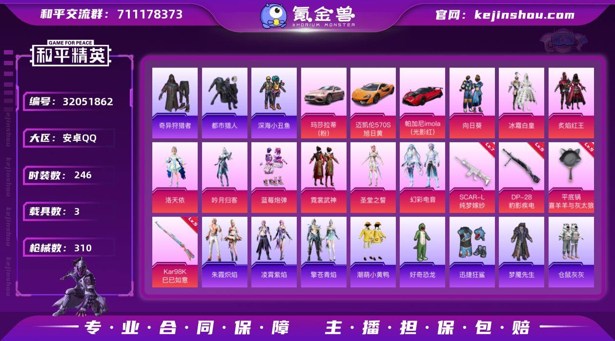 安卓 手Q-9粉装-4特效枪-3载具-2粉色飞行器-101219热力值-16王牌印记-246套装-310枪皮 【热门品类】:套装-都市猎人,套装-深海小丑鱼,套装-小丑鱼,套装-奇异狩猎者,角色-军刀雅典娜,套装-龟仙人,套装-潮萌小黄鸭,套装-暗影哥特,角色-Mark.06 【粉色套装】:粉装-向日葵,粉装-冰霜白皇,粉装-炙焰红王,角色-洛天依,粉装-吟月归客,粉装-蓝莓炮弹,粉装-霓裳武神,角色-圣堂之誓,粉装-幻彩电音 【粉色枪皮等级】:SCAR-L-纯梦嫁纱(七级),Kar98K-巳巳如意(五级),DP-28-豹影疾电(五级),平底锅-喜羊羊与灰太狼(七级) 【粉色载具】:玛莎拉蒂Ghibli(粉),迈凯伦570S(旭日黄),帕加尼imola(光影红) 【粉色枪皮】:SCAR-L-纯梦嫁纱,Kar98K-巳巳如意,DP-28-豹影疾电,平底锅-喜羊羊与灰太狼 【粉色降落伞】:深海曼妙降落伞,至尊龙雀降落伞,雪国幻梦降落伞,春暖花开降落伞,星之信仰降落伞,繁花小夜曲降落伞,童趣迷兔降落伞,怪笑疯兔降落伞,洛神天依降落伞,蓝莓炮弹降落伞,橘柚倾心降落伞,垂柳戏鸭降落伞,仲夏莫吉托降落伞,未来歌姬降落伞,圣堂之誓降落伞,智耀战神降落伞,冷漠罗丽降落伞,极意拳锋降落伞,炫彩糖果降落伞 【稀有套装】:套装-龟仙人,套装-雏菊兔兔,套装-萝兰蝴蝶,角色-米开朗基罗,套装-燕燕于飞,套装-鱼渊荷华,套装-粉恋花,套装-紫幽梦,套装-蓝冰羽,角色-猎影月神,套装-彩虹兔,套装-云朵鹅,套装-雪绒豹,角色-时希公主,角色-乐音,套装-朱霞炽焰,套装-凌霄紫焰,套装-擎苍青焰 【稀有枪皮】:AKM-冰凉西瓜,AKM-夜灯,AKM-彩虹符号,AKM-影袭,AKM-春暖花开,AKM-灼热熔岩,AKM-生命誓言,AKM-破晓战魂,AKM-虎虎生威,AKM-霓虹街区,AKM-龙的传人,M16A4-夜灯,M16A4-幻世战舞者,M16A4-甜心亚梦,M16A4-红色方程式,M16A4-蓝色火焰,SCAR-L-炫彩节...