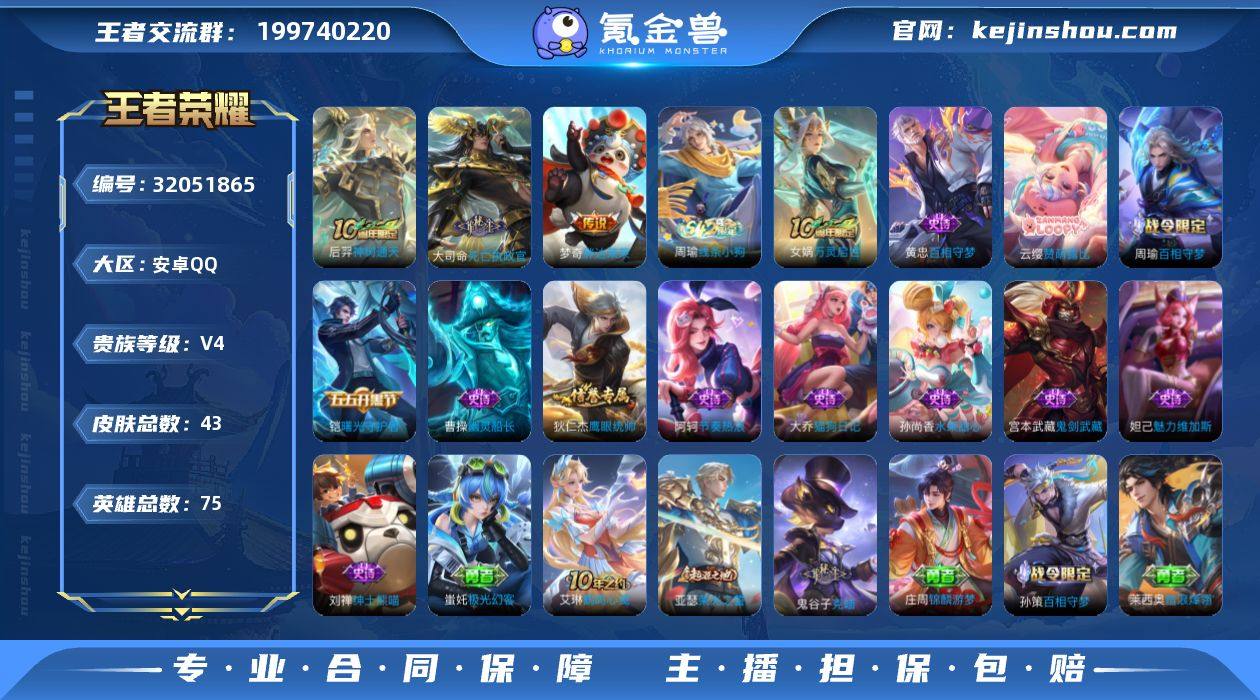 安卓Q-V4-永恒钻石V段位-75英雄-43皮肤-3传说-13史诗【传说皮肤】:后羿神树通天,大司命死亡执政官,梦奇胖达荣荣【限定皮肤】:项羽海滩派对【赛季限定】:钟馗虚灵犬护,甄姬逆浪荇歌,亚瑟荣光之誓【战令限定】:周瑜百相守梦,孙策百相守梦,周瑜线条小狗【史诗皮肤】:周瑜线条小狗,女娲万灵启世,黄忠百相守梦,云缨赞萌露比,周瑜百相守梦,狄仁杰鹰眼统帅,大乔猫狗日记,阿轲节奏热浪,铠曙光守护者,曹操幽灵船长,刘禅绅士熊喵,妲己魅力维加斯,孙尚香水果甜心,宫本武藏鬼剑武藏【其他皮肤】:蚩奼极光幻客,艾琳鹤鸣心笺,亚瑟荣光之誓,哪吒罗小黑战记,鬼谷子克喵,莱西奥踏浪烽翎,庄周锦麟游梦,孙策百相守梦,甄姬逆浪荇歌,白起死霸装,钟馗虚灵犬护,刘备浪漫序章,妲己紫罗兰之誓,张良缤纷绘卷,刘禅秘密基地,亚瑟死亡骑士,典韦黄金武士,妲己少女阿狸,芈月红桃皇后,赵云忍炎影,韩信街头霸王,项羽海滩派对,铠龙域领主,干将莫邪第七人偶,后羿精灵王,貂蝉异域舞娘【营地ID】:1592841998