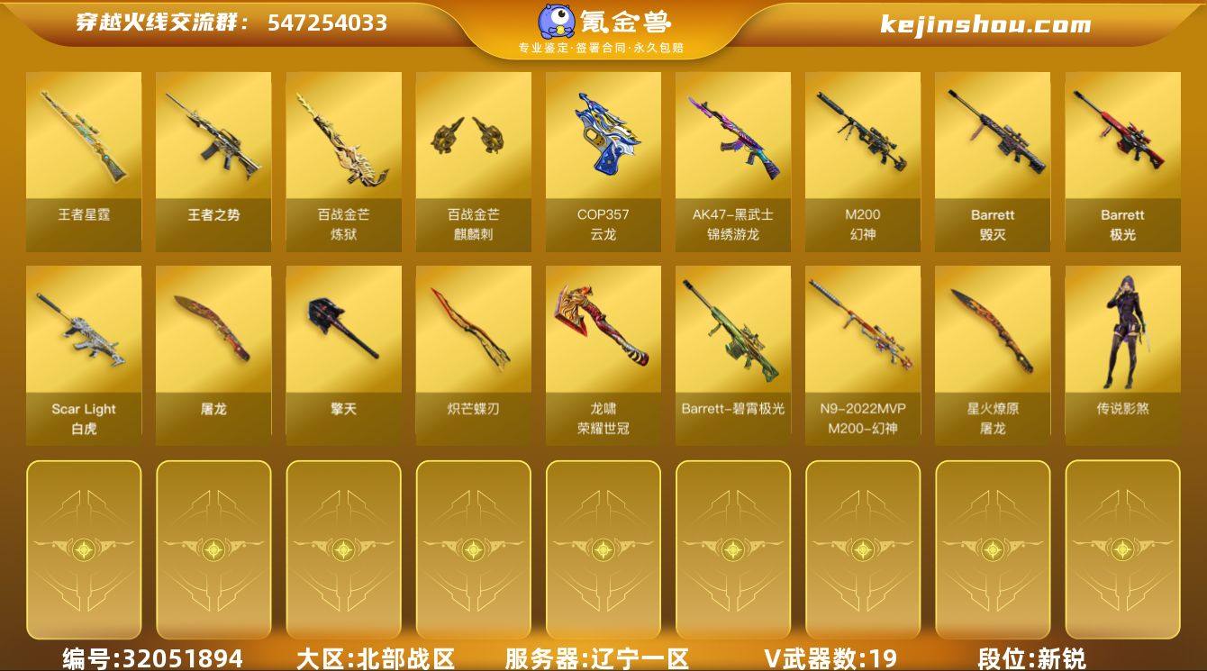 辽宁一区-20V-2王者-0炫金 【传说角色】:传说影煞 【热门武器】:Scar Light-白虎,M4A1-青龙,M200-幻神,炽芒蝶刃,荣耀世冠-龙啸 【王者炫金武器】:王者之势,王者星霆 【音效卡】:炼狱-百战金芒-庆典舞曲音效卡 【皮肤】:M200-幻神-N9-2022MVP,白虎-百战金芒 皮肤,M4A1-再燃火线,雷神-神秘按键 皮肤,屠龙-星火燎原,轻型军用手斧-再燃火线 【角色】:初恋灵狐,猎狐者-追月,斯沃特-X 【人偶武器】:M37-葵 【挑战大师】:冰龙粉碎者-白马银枪 【英雄级武器】:M4A1-青龙,Scar Light-白虎,黑武士-锦绣游龙,Barrett-毁灭*2,Barrett-极光,M200-幻神,炼狱-百战金芒,COP 357-云龙,屠龙,擎天,炽芒蝶刃,荣耀世冠-龙啸,麒麟刺-百战金芒,闪光弹-雷暴,Barrett-碧霄极光 【道具】:BS战队炫彩背包,云山科技背包,百战金芒炫彩背包,女皇终结者-魔龙之吻,绿色巨人,灵魂忍者,迷雾幽灵,夺命之镰,防化服*3,流光-鎏金之域,枪王排位28赛季金色流光,语音特效-盛典烟火,萌萌小葵表情,防弹头盔*3,防弹衣*3,C4工具钳*3,手雷包*3 【特殊枪械】:1白虎
