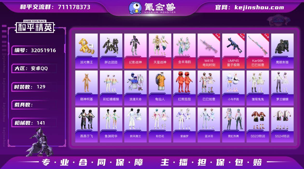 【金鞋 番茄 胖达 满地铁天赋】YXc26877-【可二次】【因赛季更新游戏段付以上号为准!】 安卓Q-3稀有3粉装5特效枪10热门129套装141枪皮 4w热力值 6印记 历史超级王牌7星 【3稀有】 浪漫天命 派对舞王 派对舞王(金靴子) 【3粉装】 金丰海韵 天星战神 幻影战神 【5特效枪】 M416-电玩时刻 (5级) Kar98K-巳巳如意 (5级) UMP45-量子极限 (5级) Mk14-福马献瑞 (5级) ACE32-萌骑漫游 (5级) 【10热门】 龟仙人 萌神柯基 红熊茄茄 鹰眼刺客 胖达团团 TT战队服 JDE战队服 狂沙舞者 漫步者 破蛋小黄鸡