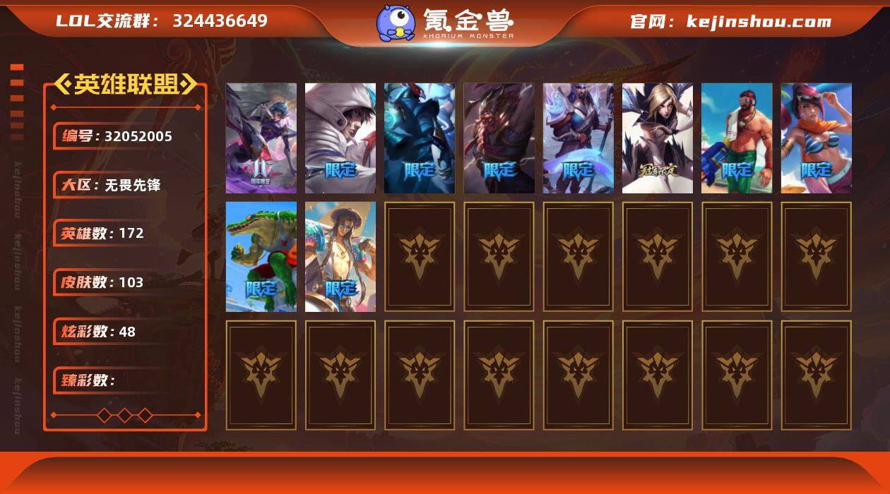 THL793【区服网通无畏先锋 段位黄铜 皮肤数量103 炫彩48 终极 神话1 传说14 限定21】172英雄-103皮肤 胜利行刑官德莱文 泳池派对雷克顿 都铎王朝老鼠 泳池派对格雷福斯 泳池派对菲奥娜 海之歌永恩 11周年卡蜜尔 冬季仙境奶妈 S8IG卡莎 S4SSW泰隆 S5SKT T1阿兹尔 S6SKTT1奥拉夫 S7SSG嘉文四世 鬼影重重魔腾 幻灵战斗队长女枪 源计划:联合艾希 女帝卡特琳娜 绝息圣堂锐雯 黑夜使者亚索 源计划:泯灭雷克顿 战地机甲厄加特 焰尾妖狐阿狸 神拳李青 西部魔影卢锡安 真实伤害艾克 墨之影武者易 神王德莱厄斯 霓虹杀拳蔚 铁血剑豪易 铁血猎手豹女 飞车暴走族酒桶 源代码索拉卡 法国皇室女枪 勇敢的心奎因 至高君王玛尔扎哈 三昧真火孙悟空 特战先锋赵信 黑帮狂花金克丝 黑帮教父格雷福斯 源计划:自由艾克 圣光审判凯尔