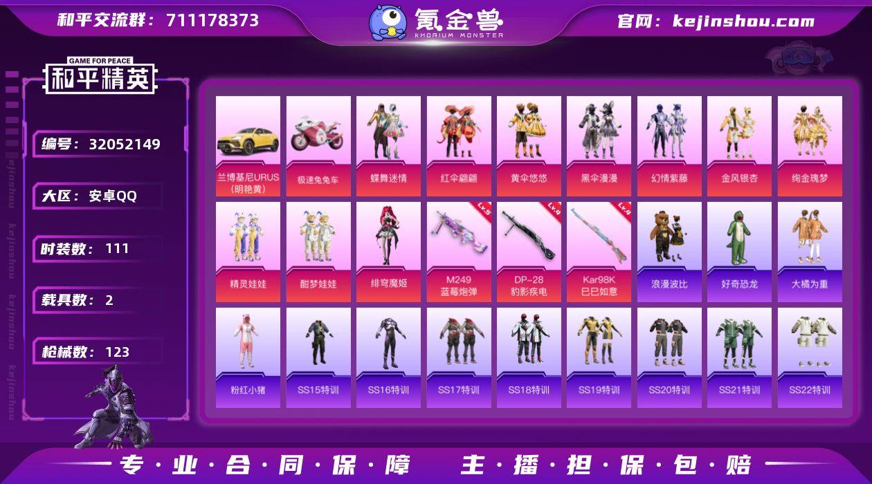 安卓 手Q-10粉装-3特效枪-2载具-2粉色飞行器-42557热力值-3王牌印记-111套装-123枪皮 【热门品类】:套装-浪漫波比,套装-粉红小猪 【粉色套装】:粉装-蝶舞迷情,粉装-红伞翩翩,粉装-黄伞悠悠,粉装-黑伞漫漫,粉装-幻情紫藤,粉装-金风银杏,粉装-绚金瑰梦,粉装-精灵娃娃,粉装-酣梦娃娃,角色-绯穹魔姬 【粉色枪皮等级】:Kar98K-巳巳如意(四级),M249-蓝莓炮弹(五级),DP-28-豹影疾电(四级) 【粉色载具】:兰博基尼URUS(明艳黄),极速兔兔车,僚机-萌兔起飞 【粉色枪皮】:Kar98K-巳巳如意,M249-蓝莓炮弹,DP-28-豹影疾电 【粉色飞行器】:春暖花开飞行器,红伞翩翩飞行器 【粉色降落伞】:甜心宝贝降落伞,春暖花开降落伞,神秘黑猫降落伞,红伞翩翩降落伞,蓝莓炮弹降落伞,绚金瑰梦降落伞,流星咚咚降落伞,甜心娃娃降落伞 【稀有枪皮】:AKM-彩虹符号,AKM-影袭,AKM-春暖花开,AKM-生命誓言,AKM-破晓战魂,AKM-虎虎生威,AKM-霓虹街区,M16A4-夜灯,M16A4-蓝色火焰,SCAR-L-炫彩节奏,SCAR-L-玉兔迎春,SCAR-L-红色方程式,SCAR-L-黄金龙骨,M416-夜灯,M416-神秘黑猫,M416-红色方程式,M416-蓝色火焰,GROZA-异彩先驱,GROZA-彩虹符号,GROZA-影袭,GROZA-懵萌河马,GROZA-春暖花开,GROZA-田园牧歌,GROZA-蓝莓炮弹,AUG-灵符少年,AUG-耀粉歌者,QBZ-神秘黑猫,M762-天降萌叽,M762-暗夜鎏金,M762-瑞龙福将,Mk47-妙红点点,AC-VAL-天降萌叽,蜜獾-天降萌叽,蜜獾-娇憨猪猪,UZI-天降萌叽,UZI-娇憨猪猪,UZI-炫彩节奏,UMP45-夜灯,UMP45-春暖花开,UMP45-涂山之恋,UMP45-生命誓言,UMP45-蓝色火焰,Vector-彩虹符号,Vector-生命誓言,Vector-田园牧歌,汤姆逊-异彩先驱,汤姆逊-炫彩节奏,汤姆逊-耀粉歌者,野牛-夜灯,MP5K-异彩先驱,MP5K-蓝莓炮弹,P90-巳巳如意,Kar98K-红伞翩翩,Kar...