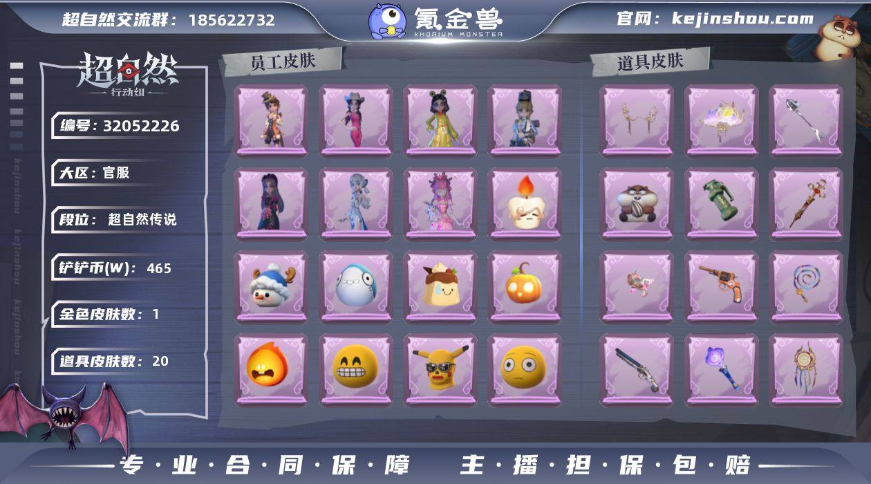 白菜出官服一金七紫春之声情公主20个道具金皮1;紫皮7;道具皮20;皮肤:兰-春之声,小黄-呱呱雨衣,巫铃儿-素影瑶光,阿念-庆宴绮愿,爱丽丝-丝缕哀歌,莉莉-情公主,爱丽丝-耀眼的你,阿念-王子与骑士;道具:摸金符-海洋之心,折扇-赴此良宵,长鞭-飞天绫,音响-鸣沙鼓,腰包-红运福虎,急救包-土拨鼠捏捏,转轮手枪-新星时代,急救包-末章心跳,音响-月光奏鸣曲,电击枪-甜蜜泡泡枪,闪光弹-金戈玄铜,铲子-撒拉弗的祷告,夜视仪-敛花容,长鞭-新春炸响,专业手电-星寂,专业手电-花束般的告白,喷气背包-乘风溯雪,短管猎枪-星光的裁决,急救包-蔷薇物语,伞-伞;饰品:头饰-嘻嘻头套,头饰-哈士奇头套,头饰-太空鲨头套,头饰-樱桃奶油布丁,头饰-蒜了八,头饰-饺饺者头套,头饰-呆滞头套,头饰-炙热烧烤,头饰-卑微头套,头饰-火爆了头套,头饰-鱼头怪头套,头饰-萨卡班甲鱼头套,头饰-滑稽头套,头饰-大葱明头套,头饰-雪墩墩头套,头饰-惊魂南瓜头套,头饰-烈焰红唇头套,头饰-烛光纪念,头饰-小狗蛇点点头套,头饰-面具马头套,头饰-像素朋克墨镜,头饰-后室幸存者头套,挂饰-不朽的今夜,挂饰-尘封旧事,挂饰-未竟乐园,挂饰-小鲨包包,挂饰-糖果守卫,挂饰-拂云仙,挂饰-桂冠聆诗,挂饰-钗头凤,背饰-梵音莲华,背饰-醉花阴,背饰-炽天使的余烬,背饰-牛啤背包;主页装扮:主页装扮-樱落金笺;动作:动作-抖肩舞,动作-新年摇,动作-卡点舞,动作-luvaboy,动作-舞台中心,动作-知世摇,动作-要糖,动作-抬手,动作-律动迪斯科,动作-举牌;工牌背景:工牌背景-珊瑚海,工牌背景-春和景明,工牌背景-心同野鹤,工牌背景-流金照庭,工牌背景-童话扉页,工牌背景-圣光之誓,工牌背景-花蕾城堡,工牌背景-粉嫩小海狸;工牌动作:工牌动作-蜕变,工牌动作-净禅,工牌动作-轻躯鹤立,工牌动作-拜年,工牌动作-鸦影;员工:薇薇安,小满,爱丽丝,阿念,莉莉,逍遥,小黄,巫铃儿,爱德华,艾伦,零,兰,...