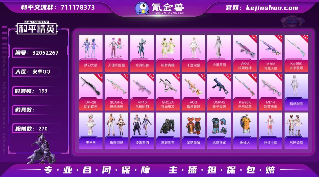 安卓 手Q-6粉装-11特效枪-0载具-1粉色飞行器-82035热力值-18王牌印记-193套装-270枪皮 【热门品类】:粉装-梦幻火箭,套装-龟仙人,套装-粉红小猪 【粉色套装】:粉装-天使彩虹糖,粉装-梦幻火箭,粉装-吟月归客,粉装-闲梦青缨,角色-千金淑猫,角色-冷漠罗丽 【粉色枪皮等级】:AKM-炫紫旋律(七级),SCAR-L-锦绣绵绵(五级),M416-电玩时刻(五级),GROZA-镜光银凌(五级),AUG-暖羊咩咩(五级),M762-电糖天使(七级),UMP45-量子极限(五级),Kar98K-未来歌姬(七级),Kar98K-巳巳如意(五级),Mk14-甜梦熊击(五级),DP-28-豹影疾电(五级) 【粉色枪皮】:AKM-炫紫旋律,SCAR-L-锦绣绵绵,M416-电玩时刻,GROZA-镜光银凌,AUG-暖羊咩咩,M762-电糖天使,UMP45-量子极限,Kar98K-未来歌姬,Kar98K-巳巳如意,Mk14-甜梦熊击,DP-28-豹影疾电 【粉色飞行器】:闪光银龙飞行器 【粉色降落伞】:梦幻火箭降落伞,星之彼岸降落伞,暗夜玫瑰降落伞,星夜魔法师降落伞,垂柳戏鸭降落伞,音爆索尼克降落伞,江南烟雨降落伞,创世·救赎降落伞,临安公主降落伞,智耀战神降落伞,星穹咏叹调降落伞,绯穹魔姬降落伞 【稀有套装】:套装-龟仙人,套装-巳巳如意,角色-超感刻度,套装-雏菊兔兔,套装-萝兰蝴蝶,套装-小熊娃娃,角色-达芬奇,套装-糖糖葫芦,套装-青团波波,角色-摩登魅猫,角色-光矢逐梦,套装-燕燕于飞,套装-鱼渊荷华,套装-旋风灵鼠,套装-粉恋花,套装-紫幽梦,套装-蓝冰羽,套装-星渊小夜曲,套装-云朵鹅,套装-雪绒豹,角色-时希公主,套装-朱霞炽焰,套装-凌霄紫焰,玩偶服-美羊羊 【稀有枪皮】:AKM-夜灯,AKM-彩虹符号,AKM-影袭,AKM-灼热熔岩,AKM-生命誓言,AKM-破晓战魂,AKM-虎虎生威,AKM-霓虹街区,AKM-龙的传人,M16A4-幻世战舞者,M16A4-甜心亚梦,M16A4-红色方程式,M16A4-蓝色火焰,M16A4-千金淑...