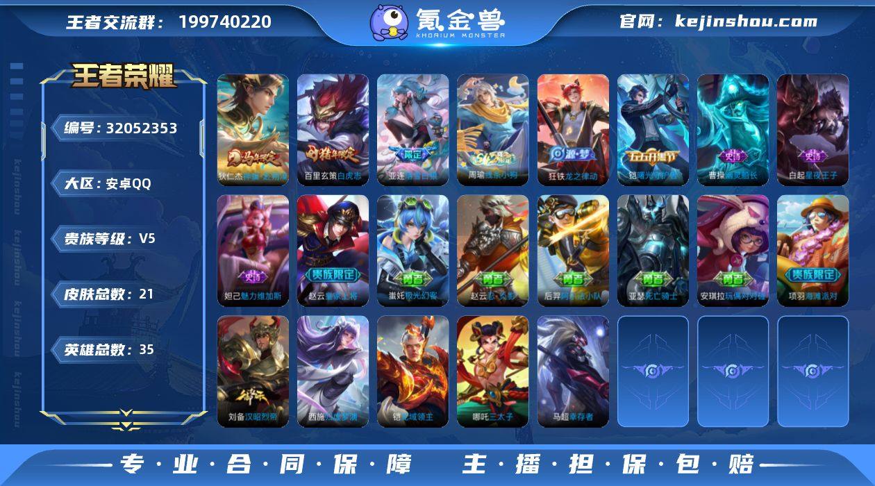 贵族等级: V5 英雄数: 35 皮肤数: 21 传说皮: 落雪白狼,神骥·赴朔漠 限定皮: 白虎志