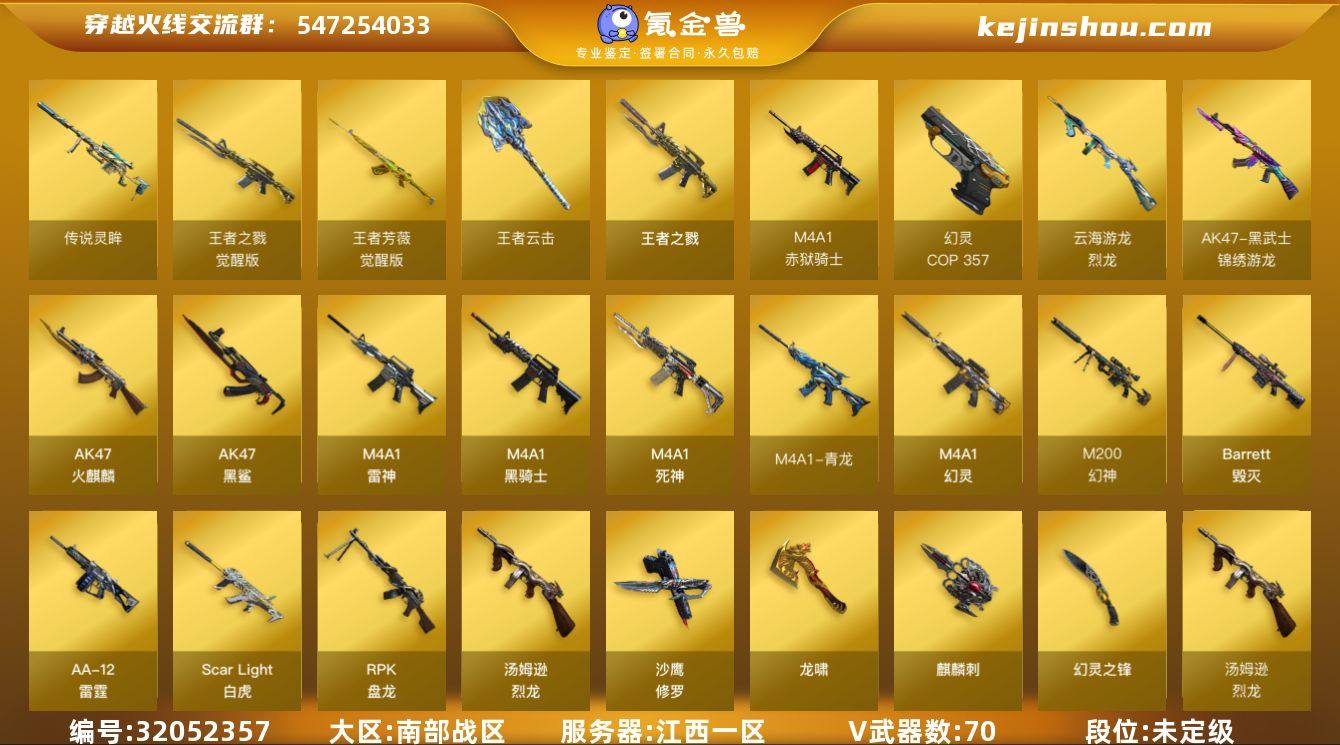 陕西一区-55V-2王者-1炫金 【热门武器】:QBZ03-金色蔷薇,M200-幻神,金色蔷薇-古蛇迷踪,修罗-古蛇迷踪,M200-竞技荣光,白虎-电玩蓝兔,Kar98K-星神,USP-雷暴,COP 357-幻灵,沙鹰-修罗,Knife-冠军之刃 【王者炫金武器】:炫金毁灭 【音效卡】:屠龙-动感闪耀 音效卡,天神-动感闪耀 音效卡,烈火-动感闪耀 音效卡,烈龙-云海游龙音效卡,擎天-云海游龙音效卡,屠龙-云海游龙音效卡,Kar98K-星神音效卡 【皮肤】:幻神-冠军之幻,幻神-星耀 皮肤,金色蔷薇-纸灯龙皮肤,QBZ03-巅峰荣耀皮肤,雷神-暗月,雷神-维纳斯皮肤,M4A1-雷神-巅峰荣耀皮肤,雷神-源计划2.0专属 皮肤,火麒麟-雷神*2,火麒麟-战神关羽,火麒麟-心动糖果,黑骑士-AG-S4冠军典藏,战神-紫绶金章皮肤,战神-流金岁月皮肤,龙啸-纸灯龙皮肤 【角色】:鹰,星际战将,王者影豹,蛇隐宗,奇洋探员,乔伊教练,云海玲珑,暗夜-X,飞虎队-X,风暴女,嘉年华灵狐,兰-新年限定,灵狐者-X,曼陀罗-X,潘多拉-X,青霞仙子,蛇姬,斯沃特-X,新娜塔莎,游珑儿 【人偶武器】:AWM-灵狐-15周年嘉年华,海滩汪汪-巴雷特,迷你牛魔王,夺魂,迷你火种,迷你艾比,迷你超能女侍 【暴走生化】:黑龙吞噬者 【挑战大师】:冰龙粉碎者-白马银枪,试炼破坏者III,神圣爆裂者-末日III 【英雄级武器】:AK47-火麒麟,M4A1-雷神,AN94-超新星,无影-神兵利器,黑武士-锦绣游龙,超新星-热带奇洋,金色蔷薇-古蛇迷踪,QBZ03-金色蔷薇,烈火-动感闪耀,AK-47-猩红传说,AK47-B-战神*2,白虎-电玩蓝兔,Barrett-毁灭,M200-幻神,Kar98K-星神,M200-竞技荣光,烈龙-云海游龙,沙鹰-修罗,USP-雷暴,COP 357-幻灵,柯尔特-竞技荣光,天神-动感闪耀,修罗-古蛇迷踪,龙啸,幻灵之锋,擎天-竞技荣光,屠龙-动感闪耀,擎天-云海游龙,龙啸-热带奇洋,屠龙-云海游龙,高...