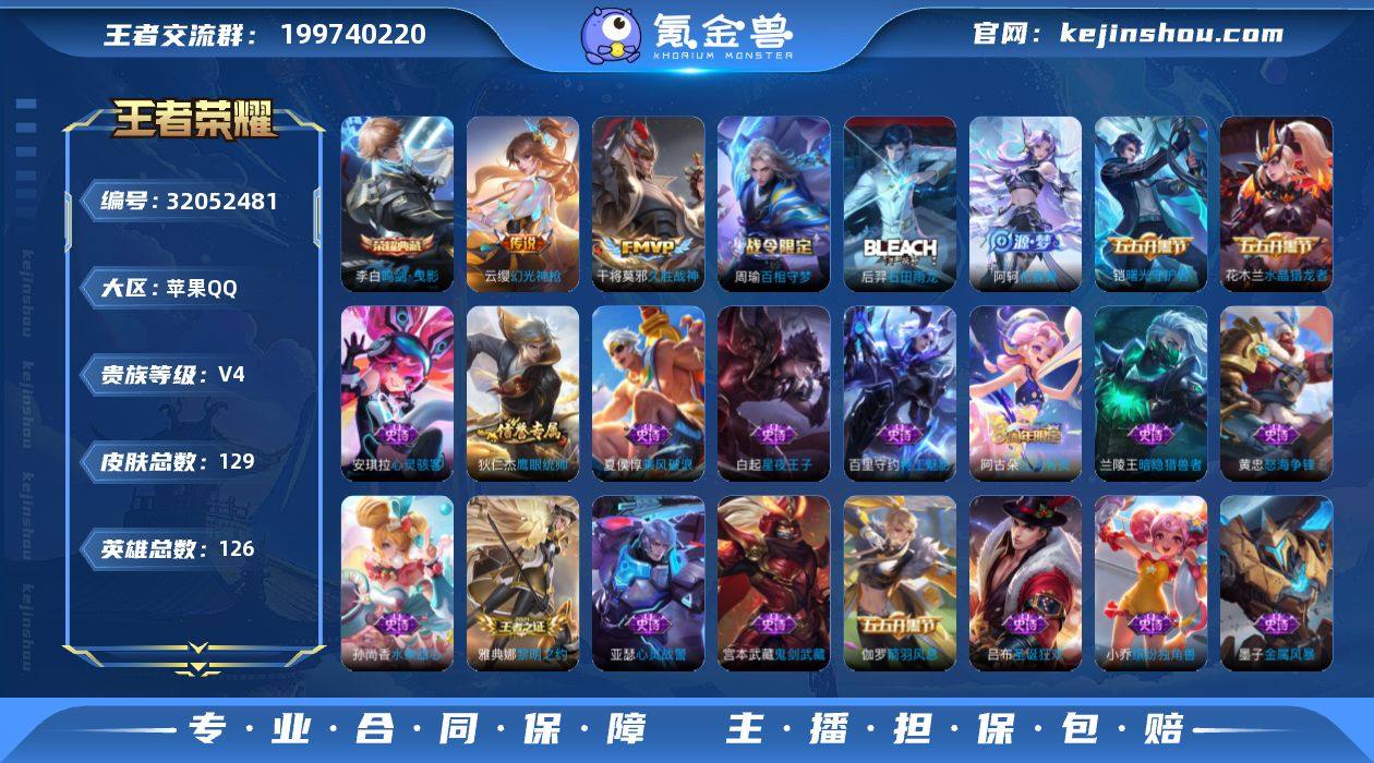 V4 1典藏 4传说 126英雄 129皮肤 可修改实名 男号 【英雄全皮】大禹全皮 【稀有英雄】大司命,韩信(韩跳跳),夏洛特(夏师傅),艾琳,橘右京(橘子),娜可露露(鸟人),不知火舞,赵云,金蝉(唐僧),戈娅 【荣耀水晶】鸣剑·曳影 【传说皮】幻光神枪,神树通天,久胜战神 【珍宝阁皮】胡桃夹子,玩趣恶龙 【赛季/战令皮】噬灭天穹(s37),古海寻踪(s33),擒涛扼浪(s31),探海日志(s32),剑破天穹(s35),天穹祈灯(s34),青焰无极,苍威无极,天穹之誓(s36),金庭之子(s27),大漠名商(s28) 【史诗皮】怒海争锋,化蝶舞,线条小狗-周瑜,九幽镇关,万灵启世,涂山容容,百相守梦-周瑜,石田雨龙,紫霞仙子,特工魅影,江河有灵,冰冠公主,猫狗日记-孙策,摇滚巨星,水果甜心,星夜王子,心灵骇客,暗隐猎兽者,鬼剑武藏,心灵战警,缤纷独角兽,乘风破浪,水晶猎龙者,曙光守护者,箭羽风息,金属风暴,圣诞狂欢,鹰眼统帅,魅力维加斯,黎明之约 【限定皮】逐霄战戟,鸣野蒿,遇见飞天 【普通皮】谧流熔炉,敬我三分,雾都夜雨,铁骨偃魂,苍林狼骑,雪境奇遇-西施,星梦巡礼,玫蓝誓约,街头霸王,龙舞盛年,熔金海岸,程咬金群星魔术团,景韶洛都,浪漫序章,虚灵犬护,荣光之誓,鹤鸣心笺,罗小黑战记-哪吒,布丁狗之约,踏浪烽翎,百相守梦-孙策,云械蓝图,逆浪荇歌,聚星闪耀,鬼谷子天穹祈灯(S34),尼罗河女神,时空谍影,五福同心,龙腾万里,归虚梦演-曜,海滩丽影,海滩派对,沉稳之力,敏锐之力,化身博士,炽热元素使,特工战影,乓乓大师,黄金武士,天使之翼,功夫老勺,哥特玫瑰,西部大镖客(牛魔),教廷特使,阴阳师,兔女郎,死亡骑士,忍·炎影,白执事,秘密基地,爱心护理,救世之瞳,冰雪圆舞曲,未来纪元-宫本武藏,玩偶对对碰,虹云星官,孤猎,荷鲁斯之眼,花见巫女,第七人偶,埃及法老,异域舞娘,战争女神,激情绿茵,加勒比小姐,芝加哥教父,年年有余,极冰防御线,魇语军师,海之征途,午夜歌剧院,战争骑士,特种部队,范...