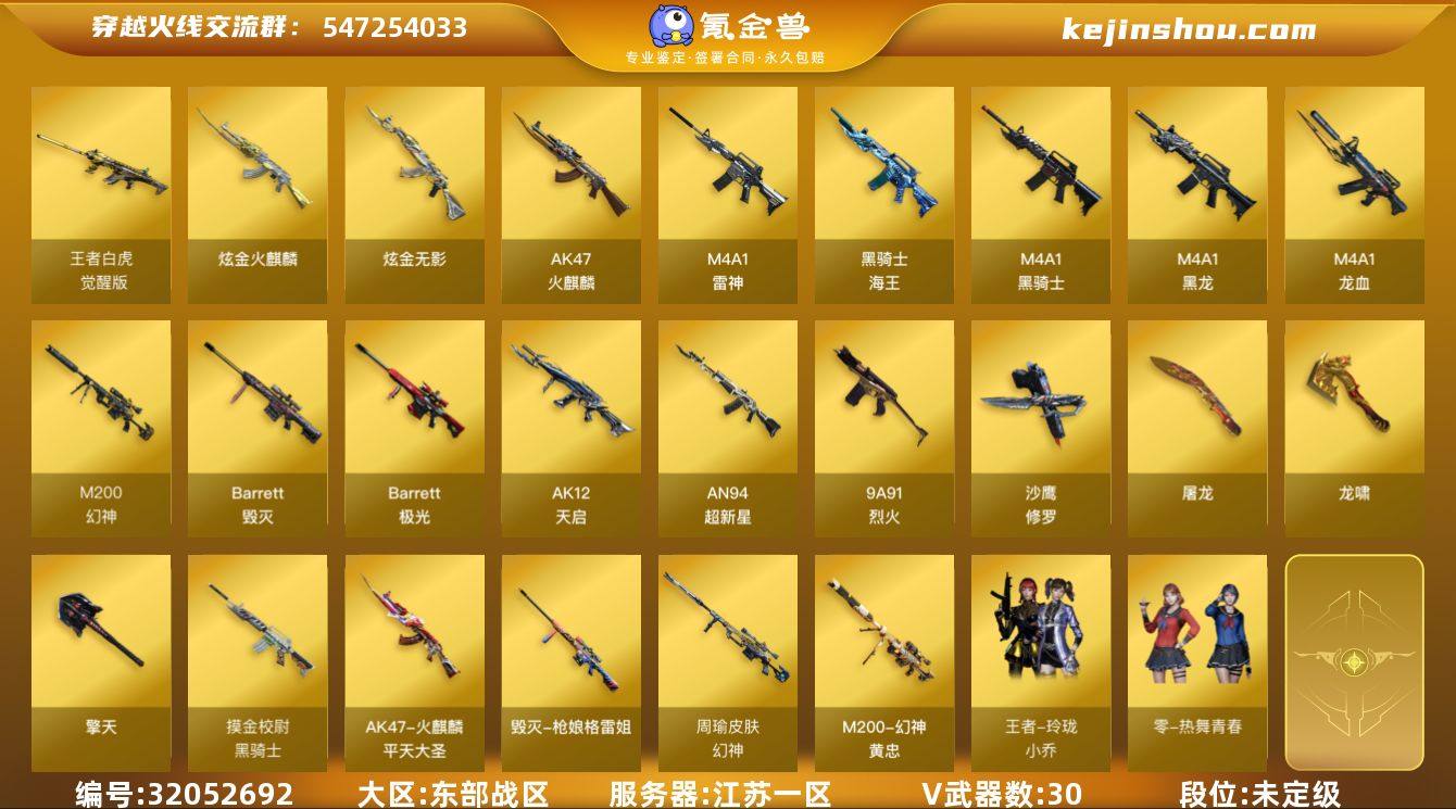 MCF860【30V 幻神三件套 幻神音效卡黄忠皮肤周瑜皮肤 黑骑士音效卡雷神音效卡】【等级】100【区服】江苏一区【英雄角色】0【英雄武器】30【王者级武器】 王者白虎-觉醒版 【炫金级武器】 炫金火麒麟 炫金无影【英雄级武器】高爆手雷-竞技荣光 烟雾弹-竞技荣光 闪光弹-竞技荣光 Barrett-毁灭 AK47-火麒麟 M4A1-黑骑士 沙鹰-修罗 沙鹰-修罗 AK12-天启 AN94-超新星 屠龙 屠龙 M200-幻神 9A91-烈火 M4A1-雷神 黑骑士-海王 M4A1-黑龙 龙啸 加特林-炼狱 龙啸 龙啸 龙啸 M4A1-龙血 擎天 M4A1-黑龙 擎天 加特林-炼狱 M200-幻神 龙啸 Barrett-极光【挑战级武器】冰龙粉碎者-白马银枪 冰龙粉碎者-白马银枪 征服者-超越觉醒 [Lv 2] AK47-冰龙粉碎者【精英级武器】TRG-21-白羊座 EVO III-赤血龙魂【通用级角色】零-水下丽影 灵狐者-黄金海岸 影武者-X 灵狐者-X 龙儿 潘多拉-X 蜀雪 潜龙队-X 暗夜-X 雪莉杨 北极狐-X 青霞仙子 曼陀罗-X 刀锋-X 妲己 零-热舞青春 娟娟 夜玫瑰-X 邱刚敖 麻雀 剑齿虎-X 圣诞潘多拉-X 虎妞 龙儿-小淘气 灵狐者-七夕宝贝 芳心审判者 初恋灵狐 社长刀锋 兔囡囡【通用级武器】魂·雷神-海滩派对 魂·Barrett-朱雀-醒狮 魂·龙啸-醒狮【强化级角色】幻影 雷霆-α 复仇者 堕天使 G.E.M.邓紫棋 精英部队 海军陆战队 铁扇公主 超能女侍 乔伊教练 雷豹【普通武器】修罗-年鹏 G36C-序章 黄金足球奖杯 龙泉剑-CFS2024 加利尔ACE-零号 红色烟雾弹 沙漠风暴-创极 GRENADE SMOKE SMOKE FLASHBANG FLASHBANG FLASHBANG FLASHBANG FLASHBANG GRENADE GRENADE GRENADE GRENADE SMOKE SMOKE SMOKE 刺刀指虎-霓虹 COP-青帝 新USP-春桃 M4A1-红色线条 粉色烟雾弹-幻能朋克