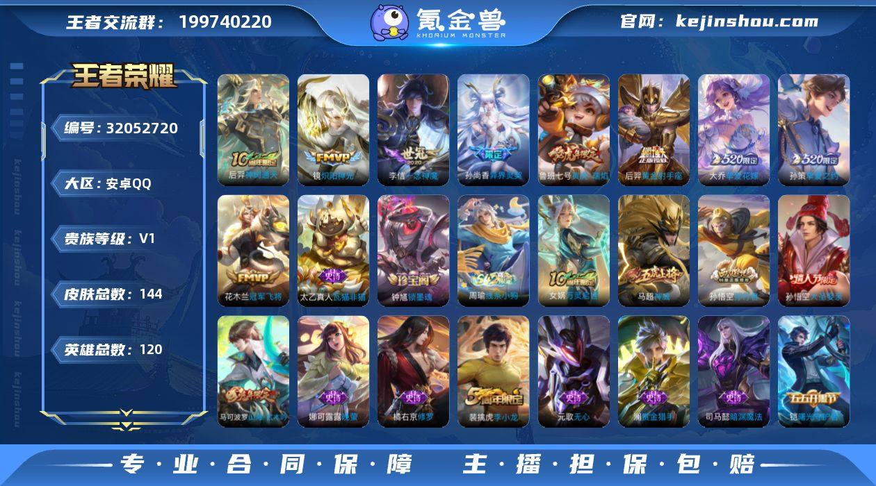 安卓Q-V6-至尊星耀IV段位-125英雄-221皮肤-1典藏皮肤-6传说-60史诗 【英雄全皮】:空空儿全皮,影全皮 【荣耀典藏】:铠银白咏叹调 【传说皮肤】:后羿神树通天,云缨幻光神枪,桑启鸣野蒿,后羿黄金射手座,宫本武藏地狱之眼,孙悟空地狱火 【限定皮肤】:蒙犽顽岩魄,蔡文姬夏日便利店,大乔绒语心约,虞姬夏日便利店,姜子牙天穹之誓,狄仁杰阴阳师,赵云皇家上将,高渐离玩趣恶龙,吕布猎兽之王,元歌云间偶戏,狄仁杰魔术师,项羽海滩派对,孙悟空孙行者,百里玄策原初追逐者,裴擒虎李小龙,云中君纤云弄巧,嫦娥拒霜思,鲁班大师探海日志,艾琳流音漫舞,司空震地狱燃心,阿古朵江河有灵,张良古海寻踪,蒙犽百解令,高渐离燃音魔法,妲己灵卜魔法,鬼谷子天穹祈灯,沈梦溪龙舞盛年,鲁班七号蔬乡物语,李元芳蔬乡物语,刘邦剑破天穹,程咬金群星魔术团,镜青焰无极,项羽苍威无极,刘备异域游侠,周瑜熔金海岸 【赛季限定】:张良古海寻踪,百里玄策原初追逐者,鲁班大师探海日志,鬼谷子天穹祈灯,刘邦剑破天穹,姜子牙天穹之誓 【战令限定】:蔡文姬夏日便利店,虞姬夏日便利店,吕布猎兽之王,元歌云间偶戏,艾琳流音漫舞,司空震地狱燃心,高渐离燃音魔法,妲己灵卜魔法,鲁班七号蔬乡物语,李元芳蔬乡物语,镜青焰无极,项羽苍威无极 【史诗皮肤】:赵云皇家上将,赵云未来纪元,貂蝉圣诞恋歌,甄姬冰雪圆舞曲,王昭君偶像歌手,狄仁杰魔术师,宫本武藏鬼剑武藏,孙尚香水果甜心,嬴政摇滚巨星,妲己魅力维加斯,墨子龙骑士,墨子金属风暴,刘禅绅士熊喵,曹操幽灵船长,张飞乱世虎臣,花木兰水晶猎龙者,夏侯惇乘风破浪,小乔缤纷独角兽,兰陵王暗隐猎兽者,雅典娜冰冠公主,安琪拉心灵骇客,百里守约特工魅影,铠曙光守护者,李元芳逐浪之夏,程咬金功夫厨神,白起星夜王子,阿轲节奏热浪,孙策猫...