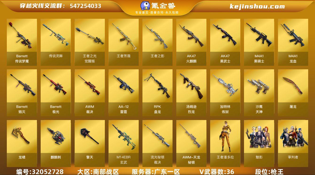 广东一区-39V-5王者-0炫金 【传说武器】:传说梦魇,传说灵眸 【热门武器】:传说梦魇,传说灵眸,M14EBR-玄武,死亡之眼,M4A1-黑骑士,汤姆逊-烈龙*5,RPK-盘龙*5,加特林-炼狱*2 【王者炫金武器】:王者之影,王者芳薇 【音效卡】:Barrett-毁灭音效卡,Barrett-极光音效卡 【皮肤】:裁决-流光秘银,毁灭-英雄计划 皮肤,天龙-秘银 【角色】:魅影,审判者,王者潘多拉,暗夜-X,风暴女,嘉年华灵狐,灵狐者-X,灵狐者-黄金海岸,麻雀,潘多拉-甜心教官,斯沃特-X,铁骑荣耀 【人偶武器】:斯泰尔-枪娘暗刃,AWM-灵狐-15周年嘉年华,COP-旗袍,迷你生化手雷*3 【暴走生化】:死亡之眼,超级对讲机 【挑战大师】:激光毁灭者III 【英雄级武器】:AK47-火麒麟,M4A1-黑骑士,AK47-黑武士,M4A1-龙血,M14EBR-玄武,Barrett-毁灭,Barrett-极光,AWM-裁决,王者之光-觉醒版,RPK-盘龙*5,加特林-炼狱*2,悦蓝-惊涛骇浪-觉醒版,汤姆逊-烈龙*5,烈龙-悦心-觉醒版,AA-12-雷霆*2,沙鹰-天神,屠龙*2,龙啸,擎天,麒麟刺*4 【道具】:战舰背包,超级背包,救世主-黑桃战神,绿色巨人,灵魂忍者,变异宝贝,迷雾幽灵,夺命之镰,防化服*2,金色流光-枪王排位,星辰流光-枪王排位,枪王排位28赛季金色流光,枪王排位29赛季金色流光,防弹头盔*6,防弹衣*6,C4工具钳*6,手雷包*6 【特殊枪械】:1黑骑士,5烈龙,5盘龙,2炼狱