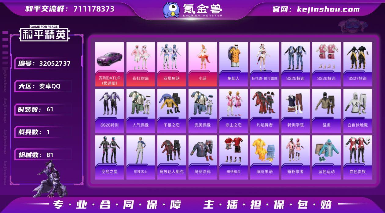 安卓 手Q-3粉装-0特效枪-1载具-3粉色飞行器-25455热力值-1王牌印记-61套装-81枪皮 【热门品类】:套装-龟仙人 【粉色套装】:粉装-彩虹甜喵,粉装-双星鱼跃,角色-小蓝 【粉色载具】:宾利BATUR(极速紫) 【粉色飞行器】:拂晓神骑飞行器,繁龙极客飞行器 【粉色降落伞】:百合蜜语降落伞,橘柚倾心降落伞,粉樱探戈降落伞,闲梦青缨降落伞,镜光幻境降落伞,花傲天降落伞,绝色倾城降落伞,精灵梦叶罗丽降落伞,金丰海韵降落伞 【稀有套装】:套装-龟仙人,角色-狂花道·娜可露露 【稀有枪皮】:AKM-破晓战魂,AKM-霓虹街区,AKM-龙的传人,SCAR-L-是爱神辣,SCAR-L-炫彩节奏,SCAR-L-粉锦千层,SCAR-L-红色方程式,M416-糯团青竹,M416-红色方程式,M416-蓝色火焰,AUG-耀粉歌者,AUG-闲梦青缨,Mk47-摩登王国,AC-VAL-天降萌叽,AC-VAL-彩虹甜喵,AC-VAL-快闪甜心,AC-VAL-灵感创作师,AC-VAL-闲梦青缨,UZI-啾咪啾咪,UMP45-生命誓言,UMP45-蓝色火焰,Vector-焰鹰斗篷,Vector-生命誓言,Vector-创世·救赎,汤姆逊-天降萌叽,汤姆逊-耀粉歌者,P90-快闪甜心,Kar98K-2B战斗服款,Kar98K-红色方程式,AWM-焰鹰斗篷,Mini14-涂山之恋,莫辛纳甘-南国舞曲,M417-惊鸿侠骨,MK20-H-快闪甜心,M200-惊鸿侠骨,S686-深海曼妙,S686-灵感创作师,S1897-春暖花开,S12K-玩趣呆呆,S12K-破晓战魂,DBS-焰鹰斗篷,DBS-圣堂之誓,AA12-G-萌物绒绒,M249-彩虹符号,M249-沙丘之主,M249-破晓战魂,DP-28-焰鹰斗篷,MG3-幻世战舞者,MG3-惊鸿侠骨,蝎式手枪-闲梦青缨,沙漠之鹰-绝色倾城,沙漠之鹰-快闪甜心,战术弩-江南烟雨,爆炸猎弓-惊鸿侠骨,撬棍-沙丘之主权杖 【其他套装】:套装-SS25特训,套装-SS26特训,套装-SS27特训,套装-SS28特训,套装-人气偶像,套装-千禧之恋,套装-完美偶像,套装-涂山之恋,套装-灼焰...