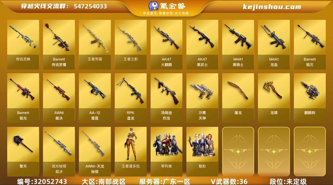 广东一区-39V-5王者-0炫金 【传说武器】:传说梦魇,传说灵眸 【热门武器】:传说梦魇,传说灵眸,M14EBR-玄武,死亡之眼,M4A1-黑骑士,汤姆逊-烈龙*5,RPK-盘龙*5,加特林-炼狱*2 【王者炫金武器】:王者之影,王者芳薇 【音效卡】:Barrett-毁灭音效卡,Barrett-极光音效卡 【皮肤】:裁决-流光秘银,毁灭-英雄计划 皮肤,天龙-秘银 【角色】:魅影,审判者,王者潘多拉,暗夜-X,风暴女,嘉年华灵狐,灵狐者-X,灵狐者-黄金海岸,麻雀,潘多拉-甜心教官,斯沃特-X,铁骑荣耀 【人偶武器】:斯泰尔-枪娘暗刃,AWM-灵狐-15周年嘉年华,COP-旗袍,迷你生化手雷*3 【暴走生化】:死亡之眼,超级对讲机 【挑战大师】:激光毁灭者III 【英雄级武器】:AK47-火麒麟,M4A1-黑骑士,AK47-黑武士,M4A1-龙血,M14EBR-玄武,Barrett-毁灭,Barrett-极光,AWM-裁决,王者之光-觉醒版,RPK-盘龙*5,加特林-炼狱*2,悦蓝-惊涛骇浪-觉醒版,汤姆逊-烈龙*5,烈龙-悦心-觉醒版,AA-12-雷霆*2,沙鹰-天神,屠龙*2,龙啸,擎天,麒麟刺*4 【道具】:战舰背包,超级背包,救世主-黑桃战神,绿色巨人,灵魂忍者,变异宝贝,迷雾幽灵,夺命之镰,防化服*2,金色流光-枪王排位,星辰流光-枪王排位,枪王排位28赛季金色流光,枪王排位29赛季金色流光,防弹头盔*6,防弹衣*6,C4工具钳*6,手雷包*6 【特殊枪械】:1黑骑士,5烈龙,5盘龙,2炼狱