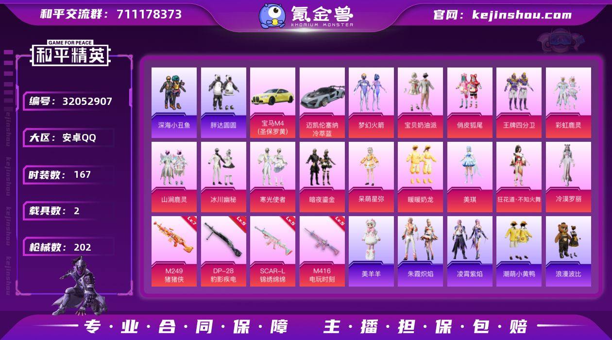 安卓 手Q-14粉装-4特效枪-2载具-3粉色飞行器-70736热力值-10王牌印记-167套装-202枪皮 【热门品类】:粉装-梦幻火箭,套装-浪漫天命,套装-深海小丑鱼,套装-胖达圆圆,套装-潮萌小黄鸭,套装-暗影哥特,套装-浪漫波比,套装-粉红小猪,套装-软软马卡龙,套装-红熊茄茄 【粉色套装】:粉装-宝贝奶油派,粉装-梦幻火箭,粉装-俏皮狐尾,粉装-王牌四分卫,粉装-彩虹鹿灵,粉装-山涧鹿灵,粉装-冰川幽秘,粉装-寒光使者,粉装-暗夜鎏金,角色-呆萌星弥,粉装-暖暖奶龙,角色-美琪,角色-狂花道·不知火舞,角色-冷漠罗丽 【粉色枪皮等级】:SCAR-L-锦绣绵绵(五级),M416-电玩时刻(五级),M249-猪猪侠(七级),DP-28-豹影疾电(五级) 【粉色载具】:宝马M4(圣保罗黄),迈凯伦塞纳(冷萃蓝) 【粉色枪皮】:SCAR-L-锦绣绵绵,M416-电玩时刻,M249-猪猪侠,DP-28-豹影疾电 【粉色飞行器】:春暖花开飞行器,歌者泠鸢飞行器,时光之吻飞行器 【粉色降落伞】:甜心宝贝降落伞,梦幻火箭降落伞,阿狸红降落伞,暗夜玫瑰降落伞,林间仙鹿降落伞,洛神天依降落伞,垂柳戏鸭降落伞,音爆索尼克降落伞,萌酷奶龙降落伞,夜幕颂歌降落伞,猪猪侠降落伞,江南烟雨降落伞,金丰海韵降落伞,千金淑猫降落伞,幻彩电音降落伞,冷漠罗丽降落伞,绯穹魔姬降落伞 【稀有套装】:套装-绒宝小鹅,套装-雏菊兔兔,套装-萝兰蝴蝶,角色-狂花道·雅典娜,套装-糖糖葫芦,套装-青团波波,角色-都市丽猫,角色-摩登魅猫,套装-霓虹热舞,套装-云朵鹅,套装-雪绒豹,角色-灵公主,套装-蜜露汐语,套装-朱霞炽焰,套装-凌霄紫焰,玩偶服-美羊羊 【稀有枪皮】:AKM-夜灯,AKM-彩虹符号,AKM-江南烟雨,AKM-生命誓言,AKM-破晓战魂,AKM-萌趣颜团子,AKM-虎虎生威,AKM-霓虹街区,M16A4-幻世战舞者,M16A4-红色方程式,M16A4-蓝色火焰,M16A4-千金淑...