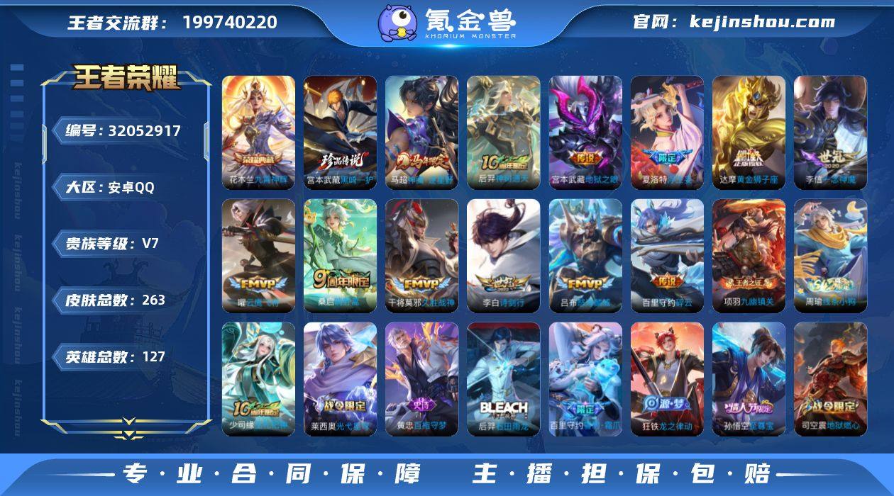 实名: 可修改 贵族等级: V7 英雄数: 127 皮肤数: 263 荣耀水晶: 九霄神辉 珍品传说: 黑崎一护 传说皮: 黄金狮子座,云鹰飞将,久胜战神,一念神魔,地狱之眼,碎云,浮生妄,神树通天,神骥·逐星野 限定皮: 冰锋战神,遇见飞天,李小龙,游园惊梦,梁祝,御风骁将,龙胆,天狼绘梦者,至尊宝,大圣娶亲,高山流水,猪悟能,诗剑行,怒海麟威,鸣野蒿