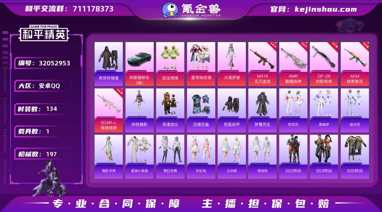 安卓 手Q-3粉装-5特效枪-1载具-1粉色飞行器-59268热力值-15王牌印记-134套装-197枪皮 【热门品类】:套装-奇异狩猎者,套装-浪漫波比 【粉色套装】:粉装-恐龙拽拽,粉装-星穹咏叹调,角色-冷漠罗丽 【粉色枪皮等级】:AKM-绿萝繁花(五级),SCAR-L-锦绣绵绵(五级),M416-五爪金龙(七级),AMR-智耀战神(七级),DP-28-豹影疾电(五级) 【粉色载具】:阿斯顿马丁DBS(绿) 【粉色枪皮】:AKM-绿萝繁花,SCAR-L-锦绣绵绵,M416-五爪金龙,AMR-智耀战神,DP-28-豹影疾电 【粉色降落伞】:精灵迷巫降落伞,阿狸红降落伞,环太平洋降落伞,星穹咏叹调降落伞,炫彩糖果降落伞 【稀有套装】:套装-粉恋花,套装-紫幽梦,套装-蓝冰羽,角色-猎影月神,套装-星渊小夜曲,套装-霓虹热舞,套装-彩虹兔,套装-云朵鹅,套装-雪绒豹,角色-绯色魅影,套装-炫彩糖果 【稀有枪皮】:AUG-冰晶雪宝,AKM-冰凉西瓜,AKM-夜灯,AKM-虎虎生威,AKM-霓虹街区,AKM-龙的传人,M16A4-幻世战舞者,M16A4-甜心亚梦,SCAR-L-炫彩节奏,SCAR-L-玉兔迎春,SCAR-L-黄金龙骨,M416-暗星紫秘,M416-糯团青竹,M416-蓝色火焰,GROZA-异彩先驱,GROZA-治愈之星,GROZA-田园牧歌,AUG-魅夜紫皇,QBZ-洛神天依,QBZ-神秘黑猫,QBZ-诡娃娃,QBZ-飞驰魅影,M762-天降萌叽,M762-拳皇97,M762-牛气冲天,M762-瑞龙福将,M762-诡娃娃,M762-镭射皇者,M762-云朵鹅,Mk47-妙红点点,Mk47-洛神天依,G36C-荒野猎神,G36C-星穹咏叹调,AC-VAL-甜心亚梦,蜜獾-娇憨猪猪,UZI-啾咪啾咪,UZI-天降萌叽,UZI-娇憨猪猪,UZI-炫彩节奏,UMP45-夜灯,UMP45-春暖花开,UMP45-生命誓言,Vector-彩虹符号,Vector-暗夜玫瑰,Vector-治愈之星,Vector-田园牧歌,汤姆逊-勇闯险境,汤姆逊-奇异狩猎者,汤姆逊-异彩先驱,汤姆逊-暗夜鎏金,汤姆逊-智耀战神,MP5K-异彩先驱,P90...