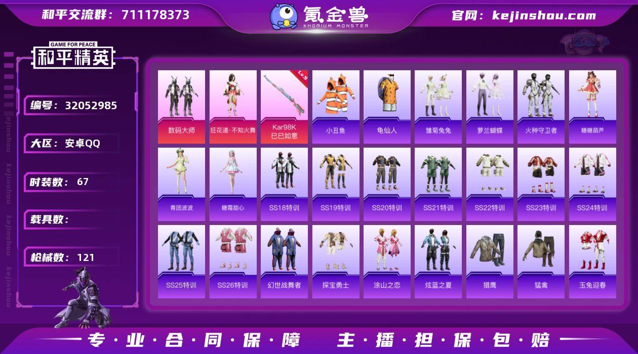 安卓 手Q-2粉装-1特效枪-0载具-2粉色飞行器-34831热力值-1王牌印记-67套装-121枪皮 【热门品类】:套装-小丑鱼,套装-龟仙人 【粉色套装】:粉装-数码大师,角色-狂花道·不知火舞 【粉色枪皮等级】:Kar98K-巳巳如意(五级) 【粉色枪皮】:Kar98K-巳巳如意 【粉色飞行器】:英伦信使飞行器 【粉色降落伞】:橘柚倾心降落伞,垂柳戏鸭降落伞,太空嘟嘟降落伞,仲夏莫吉托降落伞,精灵梦叶罗丽降落伞,英伦信使降落伞,樱桃泡泡降落伞,星穹咏叹调降落伞,异瞳寒姬降落伞 【稀有套装】:套装-龟仙人,套装-雏菊兔兔,套装-萝兰蝴蝶,套装-火种守卫者,套装-糖糖葫芦,套装-青团波波,角色-糖霜甜心 【稀有枪皮】:AKM-彩虹符号,AKM-灼热熔岩,AKM-龙的传人,M16A4-幻世战舞者,M16A4-甜心亚梦,SCAR-L-玉兔迎春,SCAR-L-红色方程式,SCAR-L-黄金龙骨,M416-糯团青竹,M416-红色方程式,GROZA-懵萌河马,GROZA-田园牧歌,AUG-天降萌叽,AUG-耀粉歌者,QBZ-飞驰魅影,M762-天降萌叽,M762-奇异狩猎者,M762-橘柚倾心,Mk47-妙红点点,G36C-懵萌河马,G36C-青丘仙客,AC-VAL-天降萌叽,AC-VAL-甜心亚梦,蜜獾-天降萌叽,蜜獾-娇憨猪猪,UZI-娇憨猪猪,UZI-红色方程式,UMP45-夜灯,UMP45-涂山之恋,Vector-生命誓言,Vector-田园牧歌,汤姆逊-天降萌叽,MP5K-飒粉甜心,P90-飞驰魅影,Kar98K-洛神天依,Kar98K-飞驰魅影,M24-幻彩电音,AWM-垂柳戏鸭,AWM-音爆索尼克,VSS-田园牧歌,Mini14-旋转彩虹,Mini14-筑梦精灵,SLR-娇憨猪猪,QBU-飒粉甜心,莫辛纳甘-懵萌河马,AMR-妙红点点,M417-惊鸿侠骨,M200-惊鸿侠骨,S686-奇异狩猎者,S686-生命誓言,S686-千金淑猫,S1897-飞驰魅影,S12K-垂柳戏鸭,S12K-娇憨猪猪,S12K-幻世战舞者,DBS-甜心亚梦,DBS-月影灵韵,SPAS-12-田园牧歌,M249-妙红点点,M249-彩虹符号,M...
