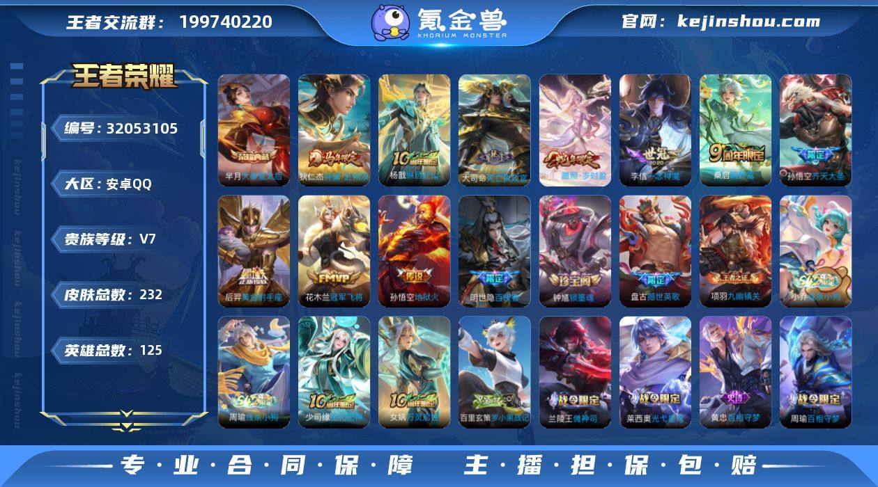 无二次-安卓Q-V7-最强王者段位-125英雄-232皮肤-1典藏皮肤-10传说-64史诗HZ263506 【英雄全皮】:孙权全皮,影全皮 【荣耀典藏】:芈月大秦宣太后 【传说皮肤】:狄仁杰神骥赴朔漠,杨戬纵目迁山,大司命死亡执政官,虞姬愿照岁时盈,桑启鸣野蒿,孙悟空齐天大圣,李信一念神魔,花木兰冠军飞将,后羿黄金射手座,孙悟空地狱火 【限定皮肤】:虞姬夏日便利店,姜子牙天穹之誓,狄仁杰阴阳师,赵云皇家上将,庄周高山流水,高渐离玩趣恶龙,芈月白晶晶,元歌无心,狄仁杰魔术师,项羽海滩派对,孙悟空至尊宝,孙悟空齐天大圣,李元芳匿光侦查者,鲁班大师探海日志,阿古朵江河有灵,张良古海寻踪,鬼谷子天穹祈灯,百里玄策超元猎域,沈梦溪龙舞盛年,刘邦剑破天穹,程咬金群星魔术团,项羽苍威无极,周瑜熔金海岸 【年限皮肤】:虞姬愿照岁时盈 【赛季限定】:鲁班大师探海日志,张良古海寻踪,鬼谷子天穹祈灯,刘邦剑破天穹,姜子牙天穹之誓,东皇太一噬灭天穹,太乙真人谧流熔炉,钟馗虚灵犬护,甄姬逆浪荇歌,亚瑟荣光之誓,牛魔星界战将,项羽九幽镇关 【战令限定】:项羽苍威无极,虞姬夏日便利店,孙悟空神迹守卫,百里守约百相守梦,老夫子百相守梦,孙膑茶境仙,马超访茗客,刘禅鸭鸭历险记,沈梦溪鸭鸭历险记,周瑜百相守梦,孙策百相守梦,兰陵王傩神司,莱西奥光弋星穹,明世隐往忆晖光,周瑜线条小狗,小乔线条小狗 【史诗皮肤】:钟馗锁墨魂,明世隐百晓客,盘古撼世英歌,周瑜线条小狗,小乔线条小狗,项羽九幽镇关,少司缘巫礼祀神,女娲万灵启世,百里玄策罗小黑战记,兰陵王傩神司,莱西奥光弋星穹,黄忠百相守梦,周瑜百相守梦,老夫子藏狐褐绒,百里守约雪豹霜爪,扁鹊灵蛊蚀心,狂铁龙之律动,刘禅鸭鸭历险记,阿轲化蝶舞,芈月瑰影绮梦,狄仁杰绮世丹青,孙膑茶境仙,牛魔星界战将,百里守约...