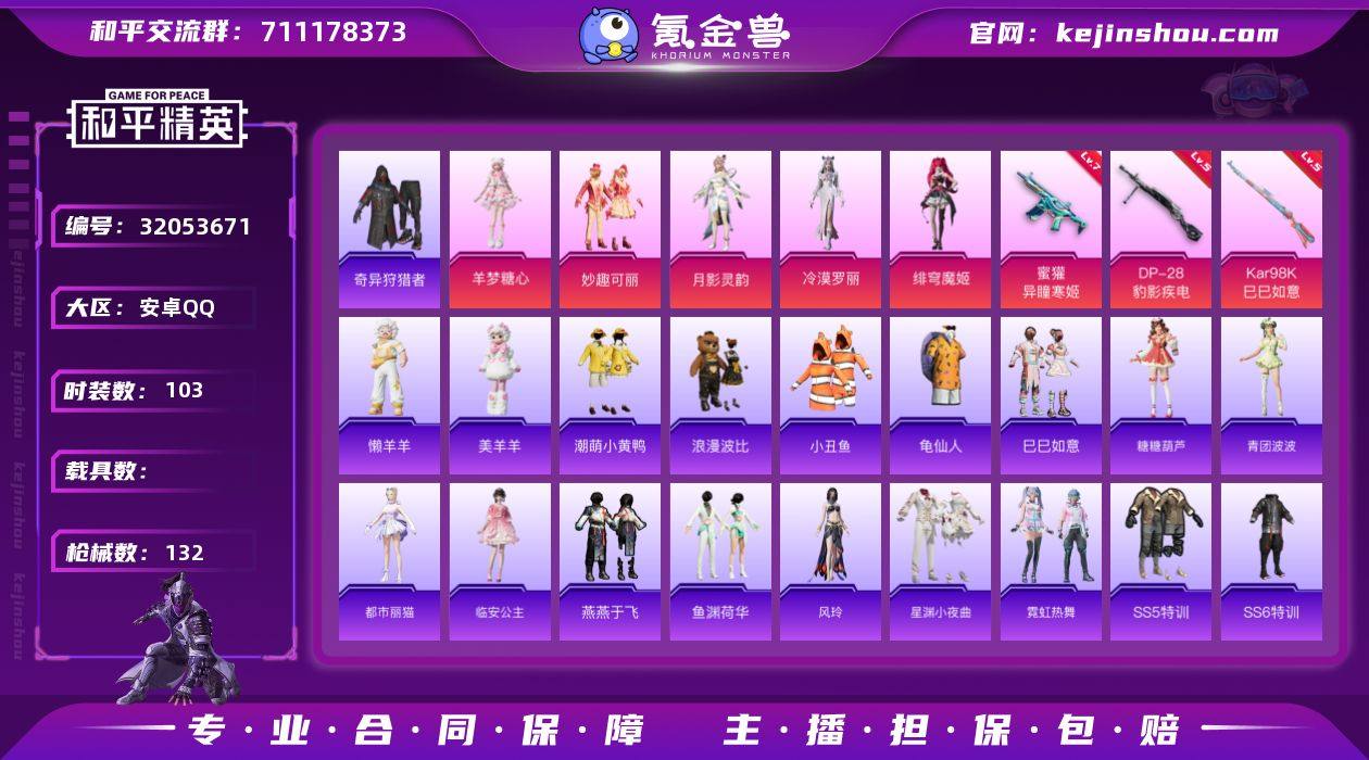 安卓 手Q-5粉装-3特效枪-0载具-1粉色飞行器-43597热力值-4王牌印记-103套装-132枪皮 【热门品类】:套装-小丑鱼,套装-奇异狩猎者,套装-龟仙人,套装-潮萌小黄鸭,套装-浪漫波比 【粉色套装】:粉装-妙趣可丽,角色-月影灵韵,角色-冷漠罗丽,角色-绯穹魔姬,角色-羊梦糖心 【粉色枪皮等级】:蜜獾-异瞳寒姬(七级),Kar98K-巳巳如意(五级),DP-28-豹影疾电(五级) 【粉色枪皮】:蜜獾-异瞳寒姬,Kar98K-巳巳如意,DP-28-豹影疾电 【粉色降落伞】:古堡领主降落伞,葫芦兄弟降落伞,环太平洋降落伞,第五大道降落伞,未来歌姬降落伞,闲梦青缨降落伞,精灵梦叶罗丽降落伞,千金淑猫降落伞,鬼刀降落伞,樱桃泡泡降落伞,星穹咏叹调降落伞,喜羊羊与灰太狼降落伞,异瞳寒姬降落伞,极意拳锋降落伞,炫彩糖果降落伞,霁蓝缠春降落伞 【稀有套装】:套装-龟仙人,套装-巳巳如意,套装-炫彩糖果,套装-糖糖葫芦,套装-青团波波,角色-都市丽猫,角色-临安公主,套装-燕燕于飞,套装-鱼渊荷华,角色-风玲,套装-星渊小夜曲,套装-霓虹热舞,玩偶服-懒羊羊,玩偶服-美羊羊,角色-馥郁金蕊 【稀有枪皮】:AKM-夜灯,AKM-彩虹符号,AKM-生命誓言,AKM-破晓战魂,AKM-萌趣颜团子,AKM-玄冥寒域,M16A4-幻世战舞者,SCAR-L-炫彩节奏,SCAR-L-玉兔迎春,SCAR-L-红色方程式,M416-糯团青竹,M416-红色方程式,M416-蓝色火焰,M416-黄金狮王,GROZA-影袭,GROZA-春暖花开,GROZA-黑色刀锋,AUG-天降萌叽,AUG-耀粉歌者,QBZ-洛神天依,QBZ-绒兔团圆,M762-天降萌叽,M762-第五大道,M762-绯红前夜,AC-VAL-彩虹甜喵,UZI-啾咪啾咪,UZI-魔法学院,UMP45-涂山之恋,UMP45-炫光之旅,UMP45-生命誓言,UMP45-蓝色火焰,Vector-彩虹符号,Vector-生命誓言,Vector-黑色刀锋,汤姆逊-天降萌叽,汤姆逊-樱桃泡泡,MP5K-繁花小夜曲,P90...